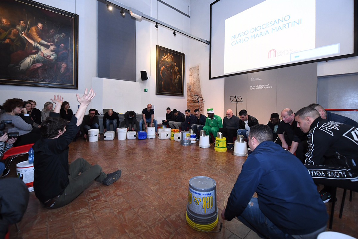 Infine, la performance musicale – applauditissima dal folto pubblico – realizzata da 16 reclusi del Laboratorio musicale del penitenziato di Monza, curato da Max Ruggeri e Sebastiano Longoni. Tubi, pentole, barattoli di vernice usati come percussioni in un crescendo travolgente, dal titolo “I ritmi dal mondo”.