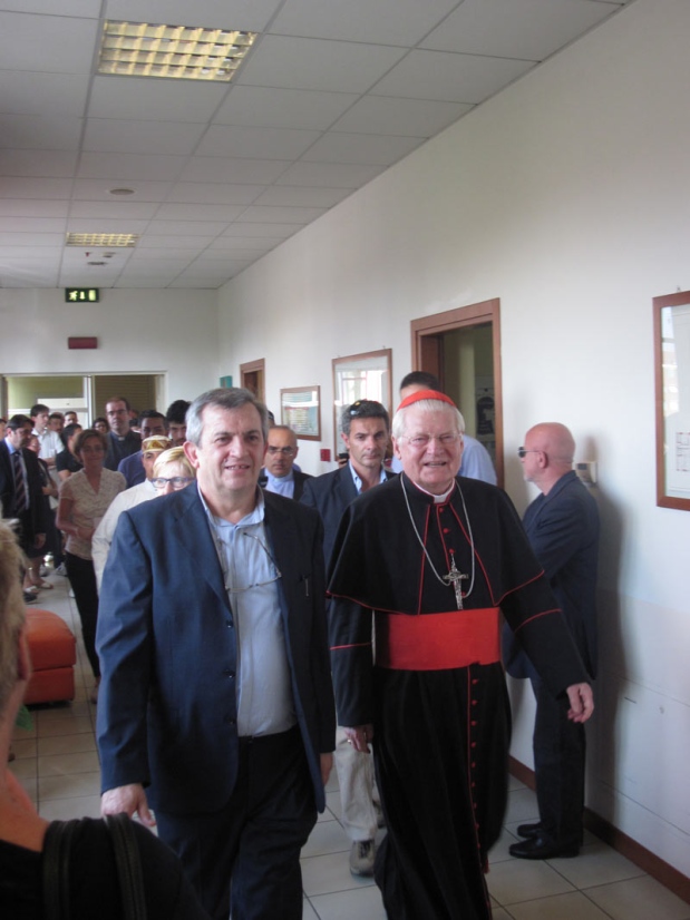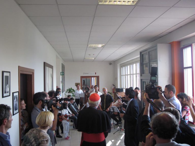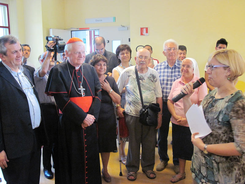 Accompagnato da ospiti, volontari e operatori in una visita della Casa, seppur in rapida successione Scola ha potuto vedere illustrate le diverse attività che vi si svolgono, da quelle di prima accoglienza familiare a quelle più culturali, come la Biblioteca di Confine (con 7 mila volumi, 24 periodici e 400 audiovisivi, inserita nel progetto Bibliorete www.bibliorete.org).