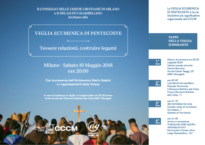Con la presenza dell’Arcivescovo e dei rappresentanti delle Chiese, la Veglia si avvierà dall’Istituto penale minorile Beccaria (via dei Calchi Taeggi 20), da cui partirà la prima tappa (“Legami feriti”). Alle 20.30, sul piazzale della parrocchia di San Giovanni Battista alla Creta, la seconda tappa dal titolo “Lasciatevi riconciliare”. Poi si proseguirà arrivando alla Casetta verde di via Odazio, per la sosta “Ricostruiamo la casa”. Infine, in largo Giambellino, presso la parrocchia del Santo Curato d’Ars, si approfondirà il tema “Il miracolo dello Spirito: sinfonia di voci” (in caso di maltempo la Veglia si svolgerà dalle 20.30 nella parrocchia di San Giovanni Battista alla Creta).