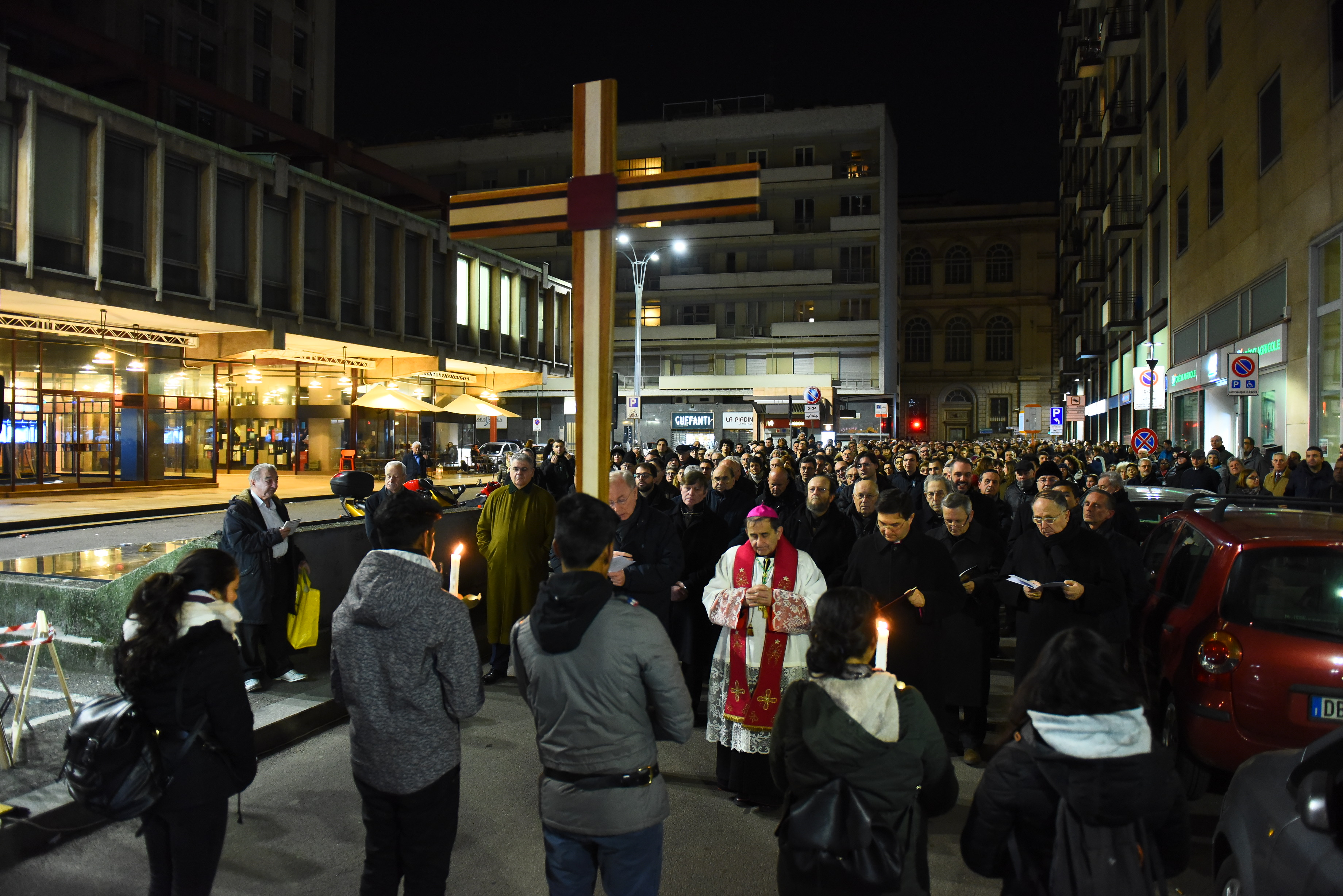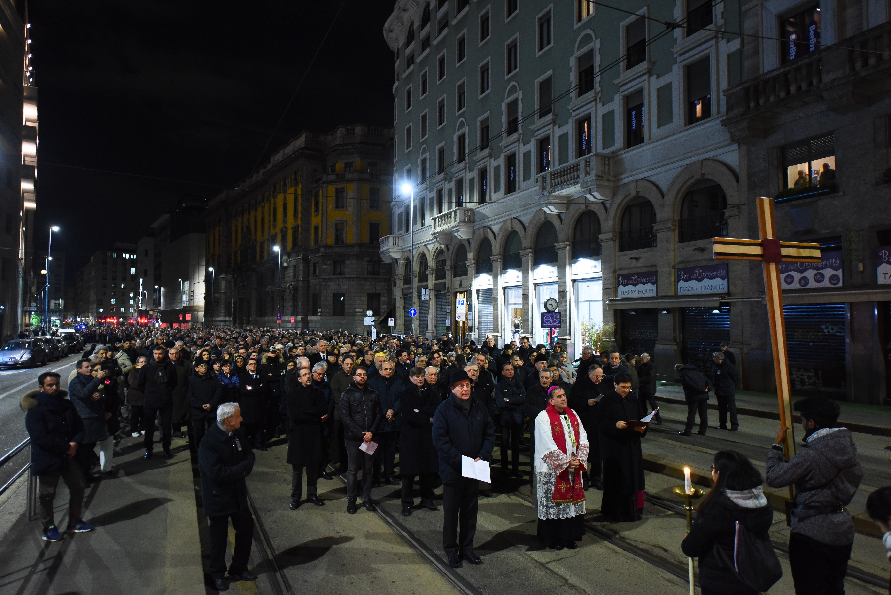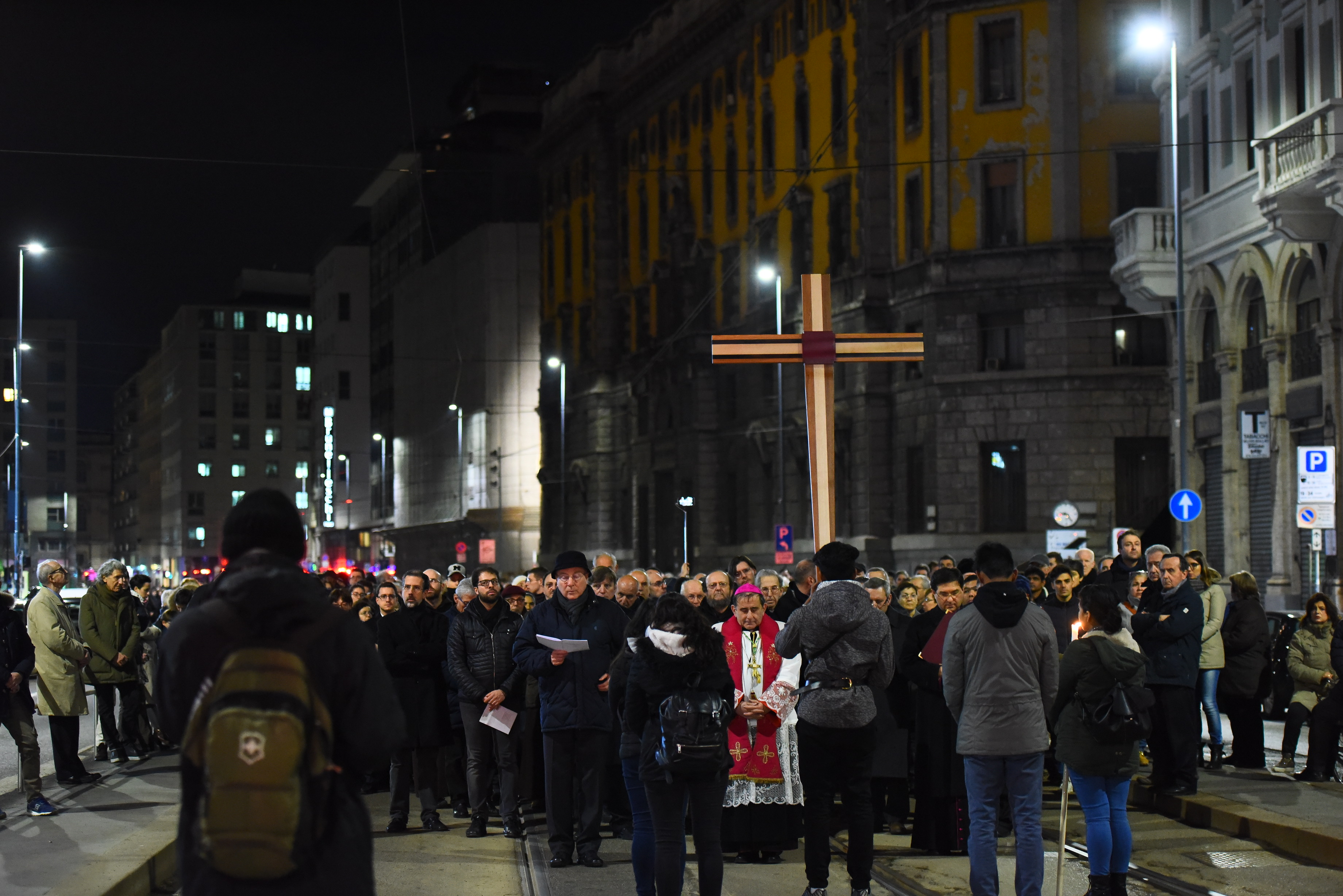 l cammino seguendo la croce nel cuore di una Milano in cui risuonano i canti e la preghiera, laddove, solitamente, c’è solo traffico senza fine e il rumore quotidiano della grande metropoli.