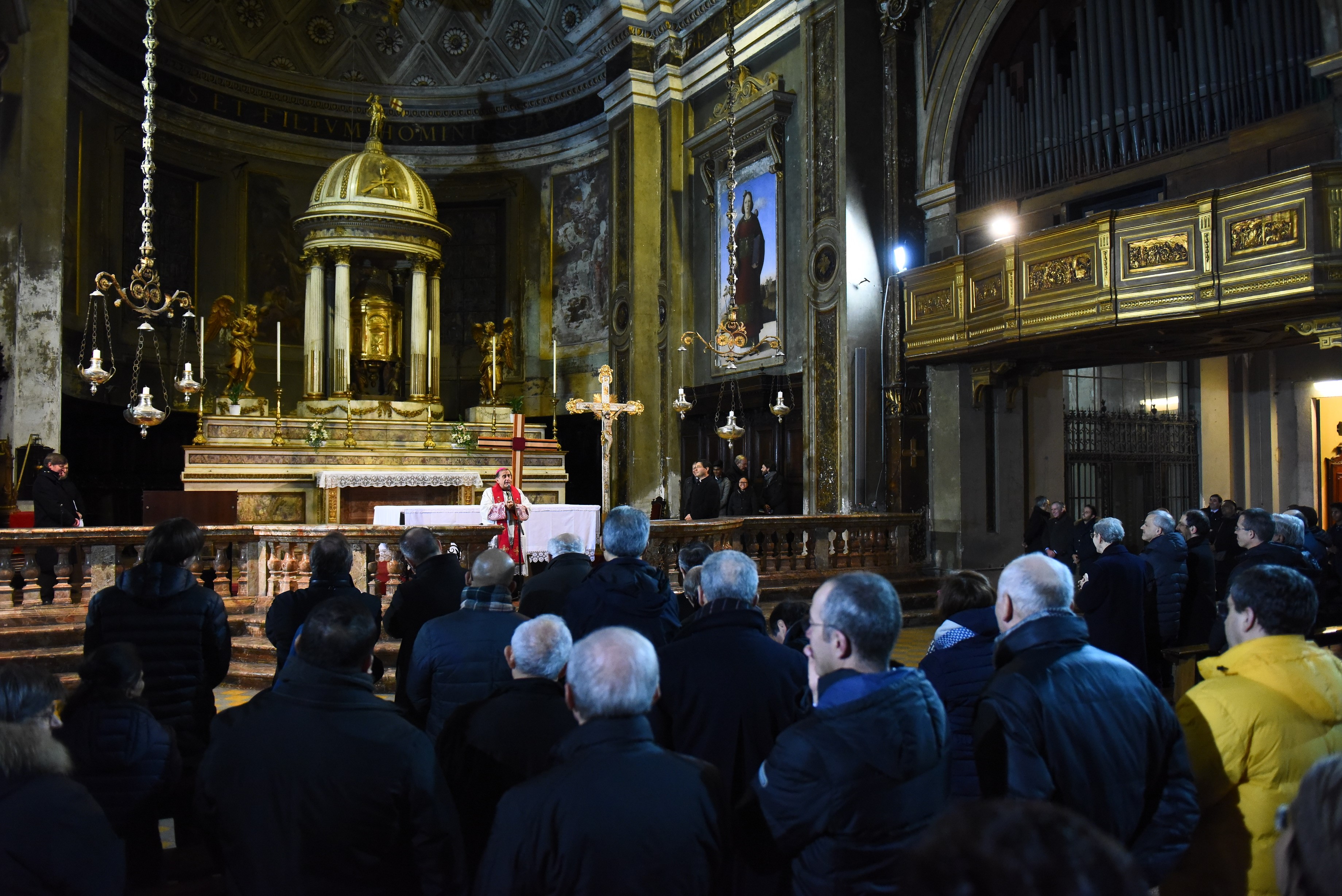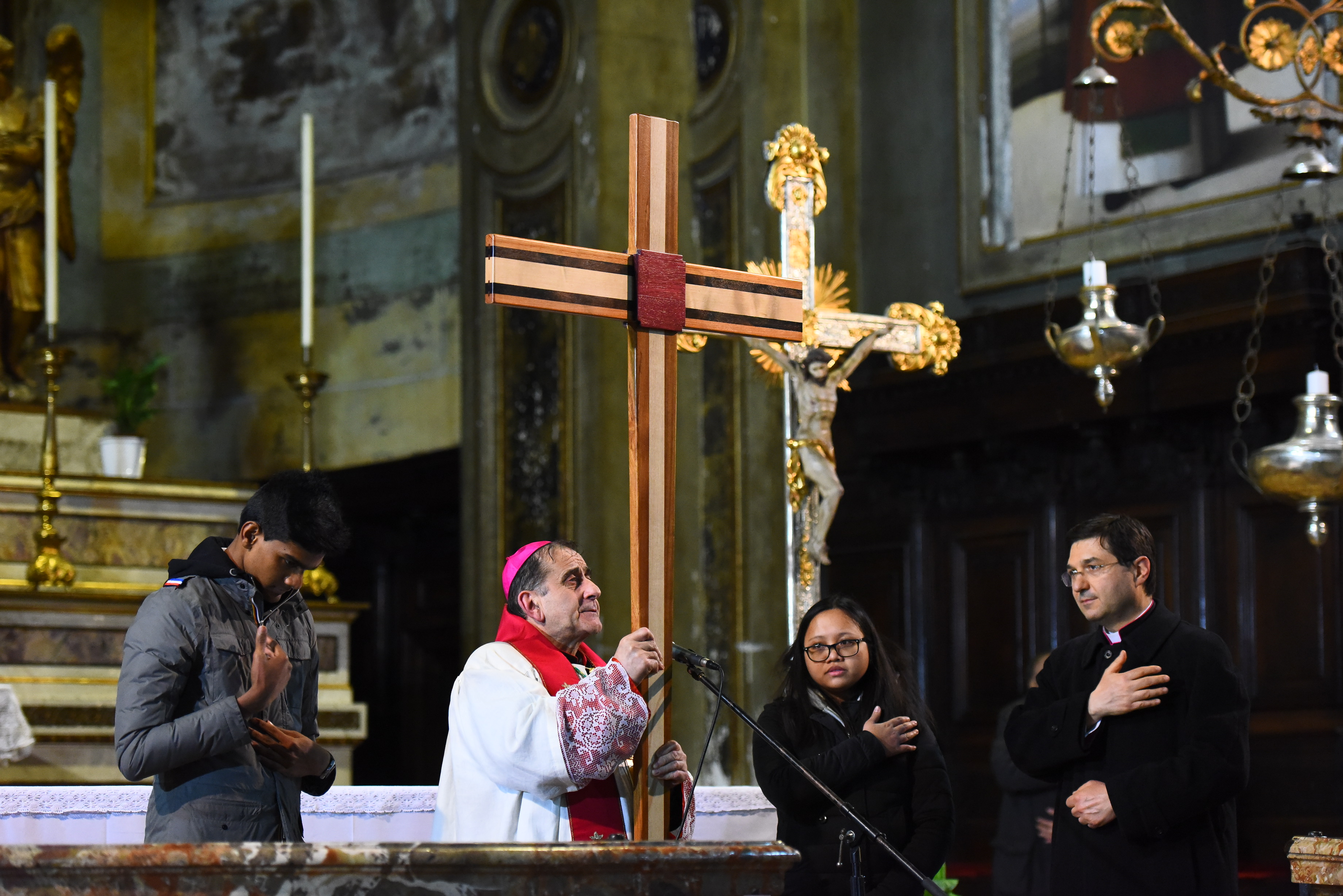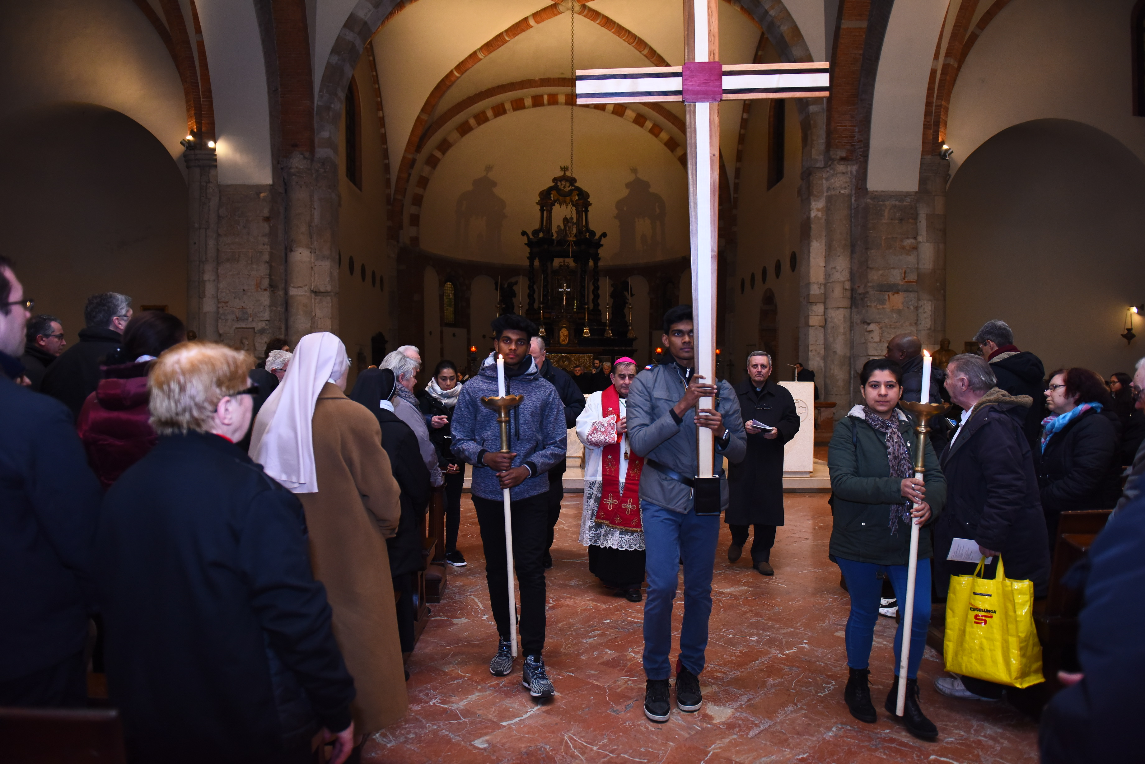 La Via Crucis per la Zona Pastorale I-Milano si snoda, con la partecipazione di circa 2000 fedeli, sull’asse di via Larga che, dalla basilica dei Santi Apostoli e Nazaro Maggiore porta a piazza Santo Stefano dove, nella basilica omonima, si conclude il Rito. Quattro, come per le altre Viae Crucis zonali, le Stazioni nelle quali si sosta – I, IV, IX e XII –, in una sorta di moderna salita al Calvario, compiuta tra le luci dei locali dell’happy hour e luoghi simbolo della città come la Torre Velasca. Tanta la gente, con i sacerdoti e i diaconi; accanto all’Arcivescovo ci sono il vicario episcopale di Zona, monsignor Carlo Faccendini, i vescovi, monsignor Erminio De Scalzi e monsignor Paolo Martinelli, i responsabili della Comunità Pastorale “Santi Apostoli”, don Ettore Colombo, e della parrocchia generale dei Migranti, don Alberto Vitali, che ha sede in Santo Stefano Maggiore. Sono, infatti, presenti molti appartenenti alle diverse Cappellanie cittadine, alcuni dei quali animano la liturgia con la preghiera accompagnata da melodie eseguite nelle diverse lingue madri e leggendo le testimonianze ai piedi della croce che richiama anch’essa l’unica Chiesa, essendo stata realizzata per il Sinodo Minore “Chiesa dalle Genti”. Tutto, insomma, parla del momento sinodale che, come Diocesi, stiamo vivendo e di una fede antica, radicata, seppure visibile oggi nei molti e diversi volti della multietnicità e del mutamento metropolitano.