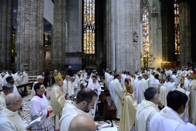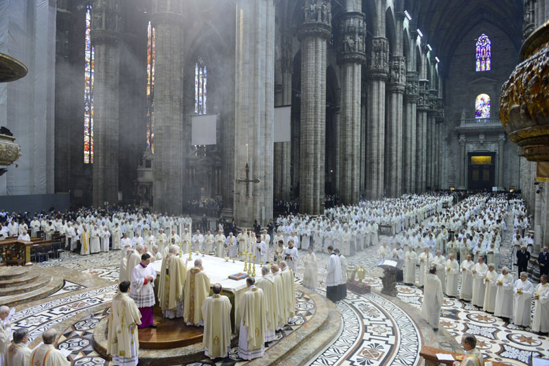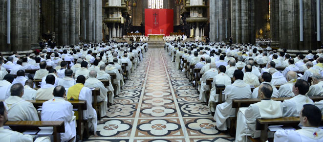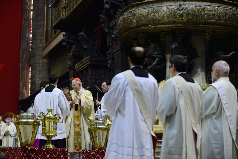 Durante la celebrazione della Messa Crismale vengono rinnovate le promesse sacerdotali. Il cardinale Scola ha voluto ribadire il valore della «vita spesa» per gli altri: «Sappiamo bene quante resistenze permangano in noi all’offerta, al perdere totalmente la vita, eppure è veramente quello che vogliamo». In questo senso ha ricordato il «rinnovato percorso di Comunità Seminaristica Adolescente» che, ha detto rivolgendosi direttamente ai sacerdoti, «affido a voi tutti». In conclusione, ricordando «l’unità del presbiterio con il Vescovo, nella comunione ecclesiale» espressa nella Messa Crismale, in essa Scola ha motivato «l’odierna colletta in favore dell’Opera di Aiuto Fraterno». Infine l’annuncio dell’istituzione di «una Commissione per lo studio del problema di una perequazione economica fra le parrocchie».