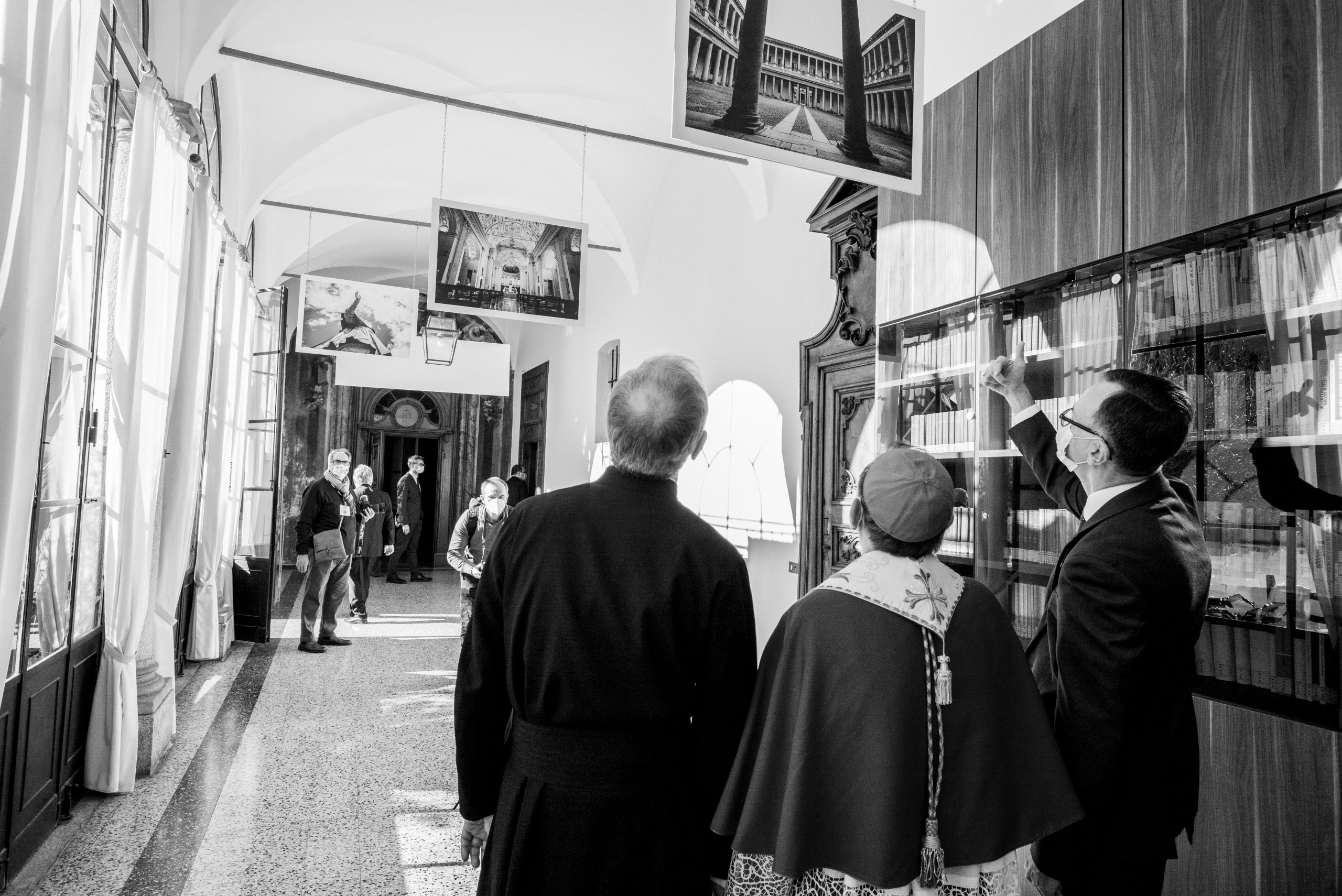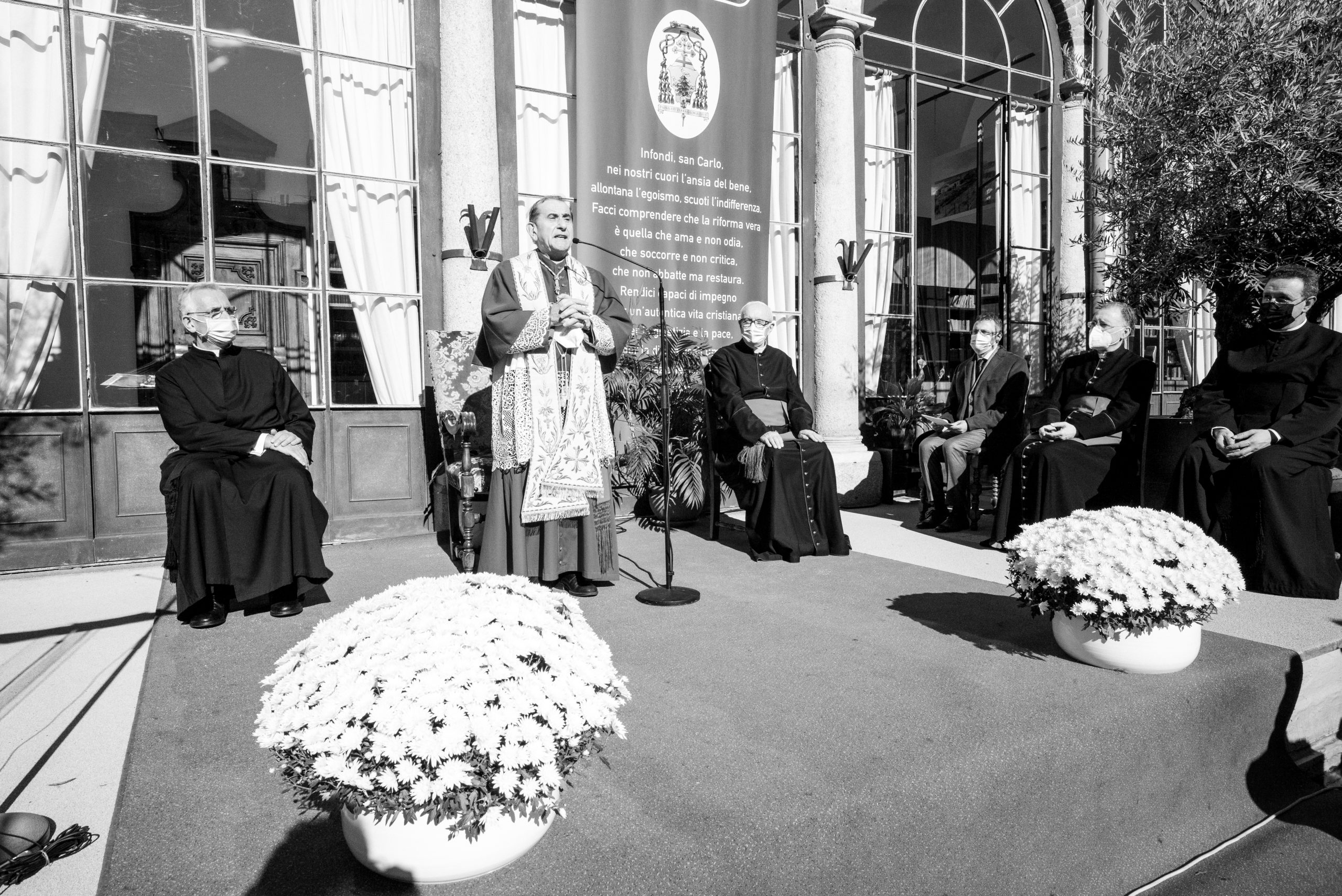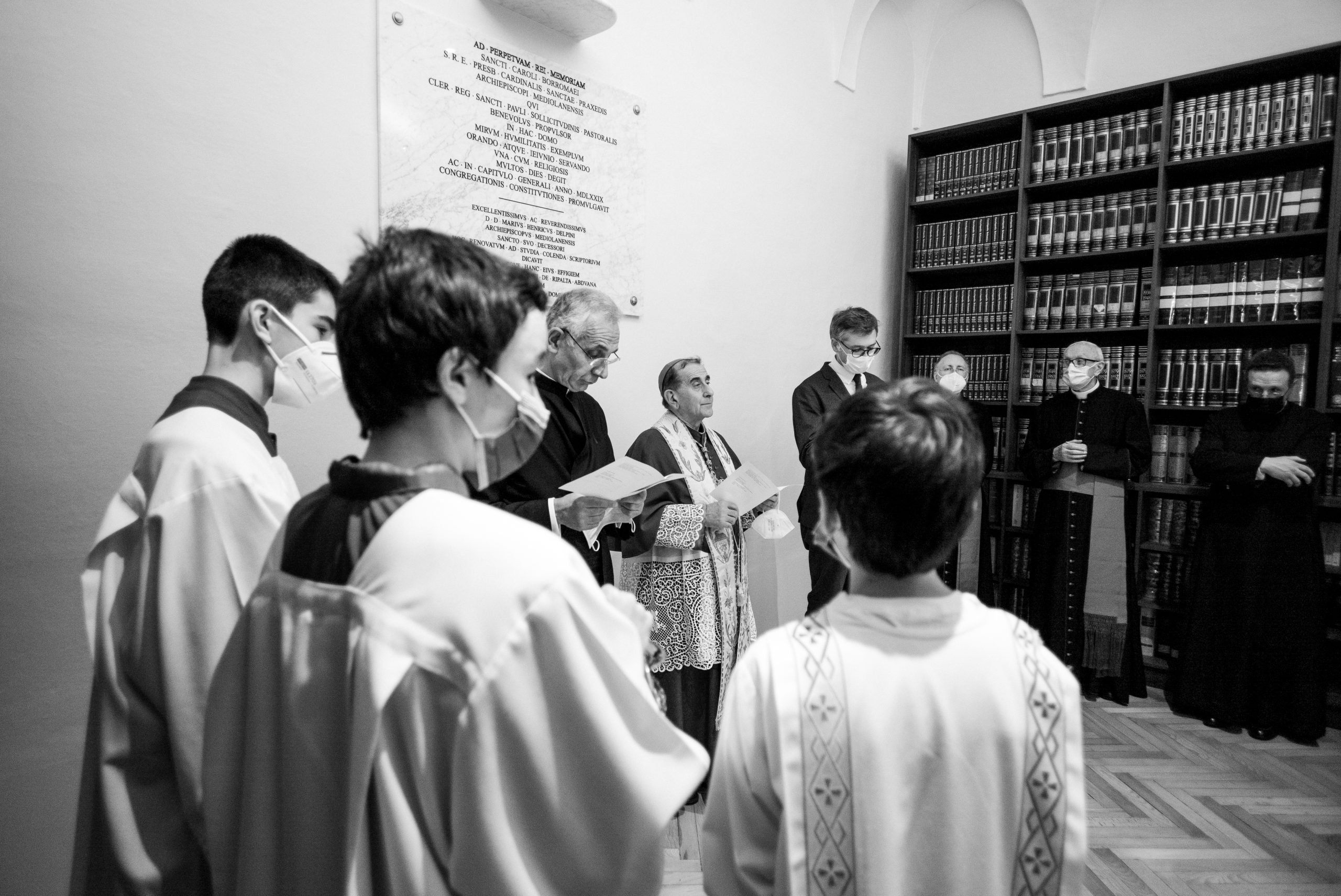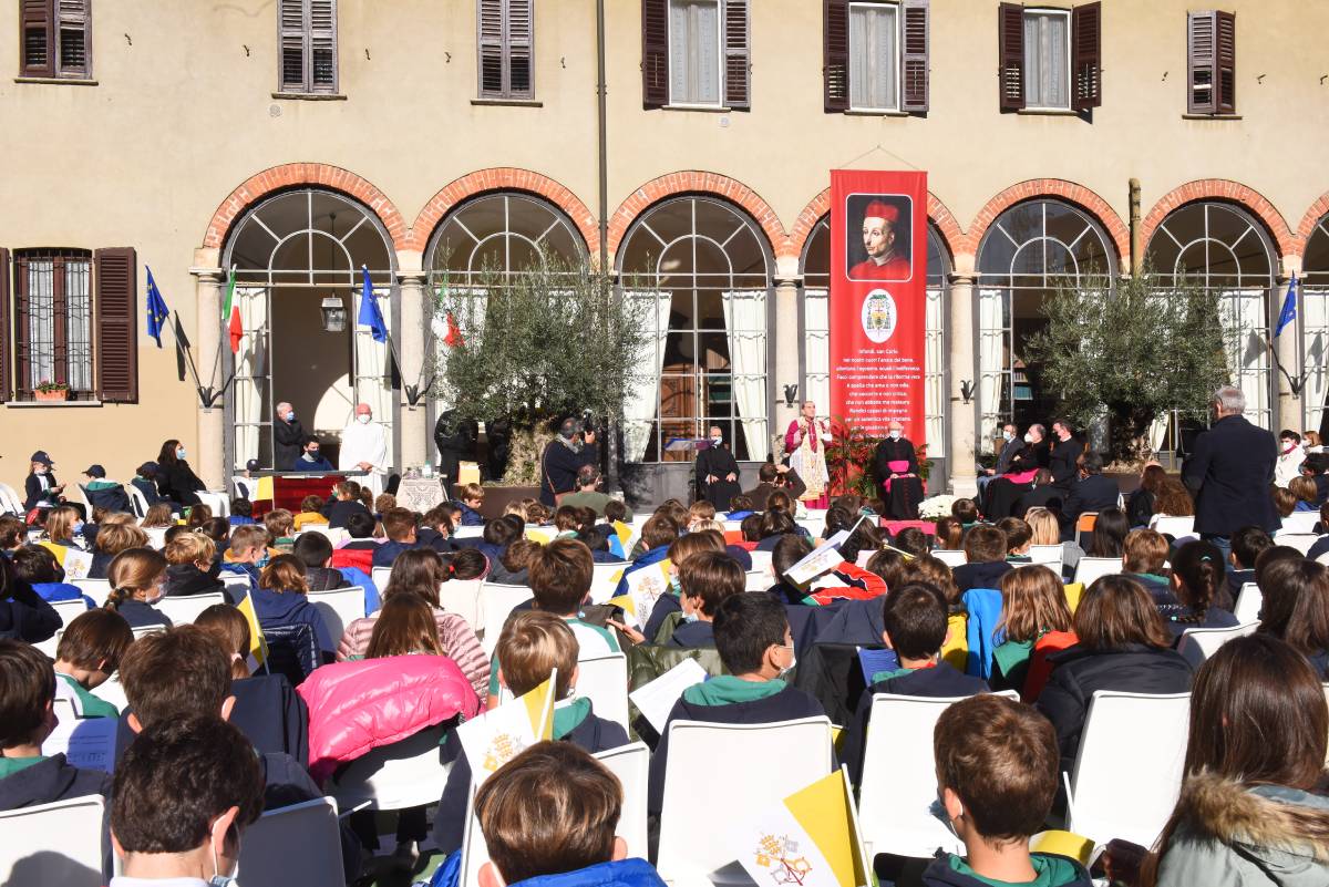 Impartita poi la benedizione a tutti, l’Arcivescovo ha inaugurato la bellissima mostra fotografica dell’ex alunno Alessandro Giugni che «sulle tracce di san Carlo» ha ripercorso attraverso le immagini i luoghi più suggestivi della vita del Santo. L’Arcivescovo ha quindi intitolato la sala letture della biblioteca a san Carlo, inaugurando un busto del Santo e una lapide latina commemorativa, e partendo dalla sua esperienza di insegnante, ha voluto sottolineare che ha maturato la convinzione che sia «impossibile insegnare ogni cosa, spiegare tutto ed esaurire il programma, anche all’interno di una sola disciplina. Non dovrebbe essere quello l’obiettivo primario di un docente. Certo, il sapere deve essere trasmesso e gli studenti devono poter maturare delle conoscenze. Eppure, proprio osservando un luogo come una biblioteca si può ricavare un grande insegnamento. La biblioteca contiene una grande quantità di libri già scritti, che rappresentano quindi un sapere “passato”. In essa non si trovano invece tutti quei testi che ancora non sono stato scritti e che invece conterranno le conoscenze e il sapere necessari per andare verso il futuro. Tuttavia, proprio la biblioteca può diventare il punto di contatto tra passato e futuro. In essa può e deve nascere il desidero di imparare, di scoprire, di conoscere. Buon insegnante allora è colui che punta a stimolare questa passione negli studenti che avranno così gli strumenti e la curiosità necessari per uno studio vero, dal quale magari nasceranno proprio quei libri che ancora non ci sono».