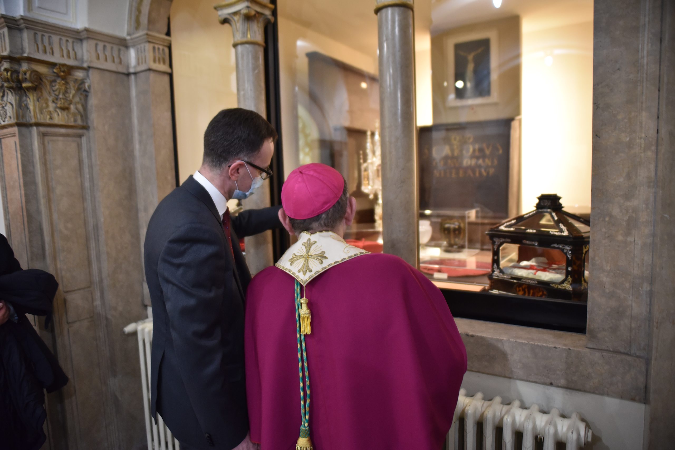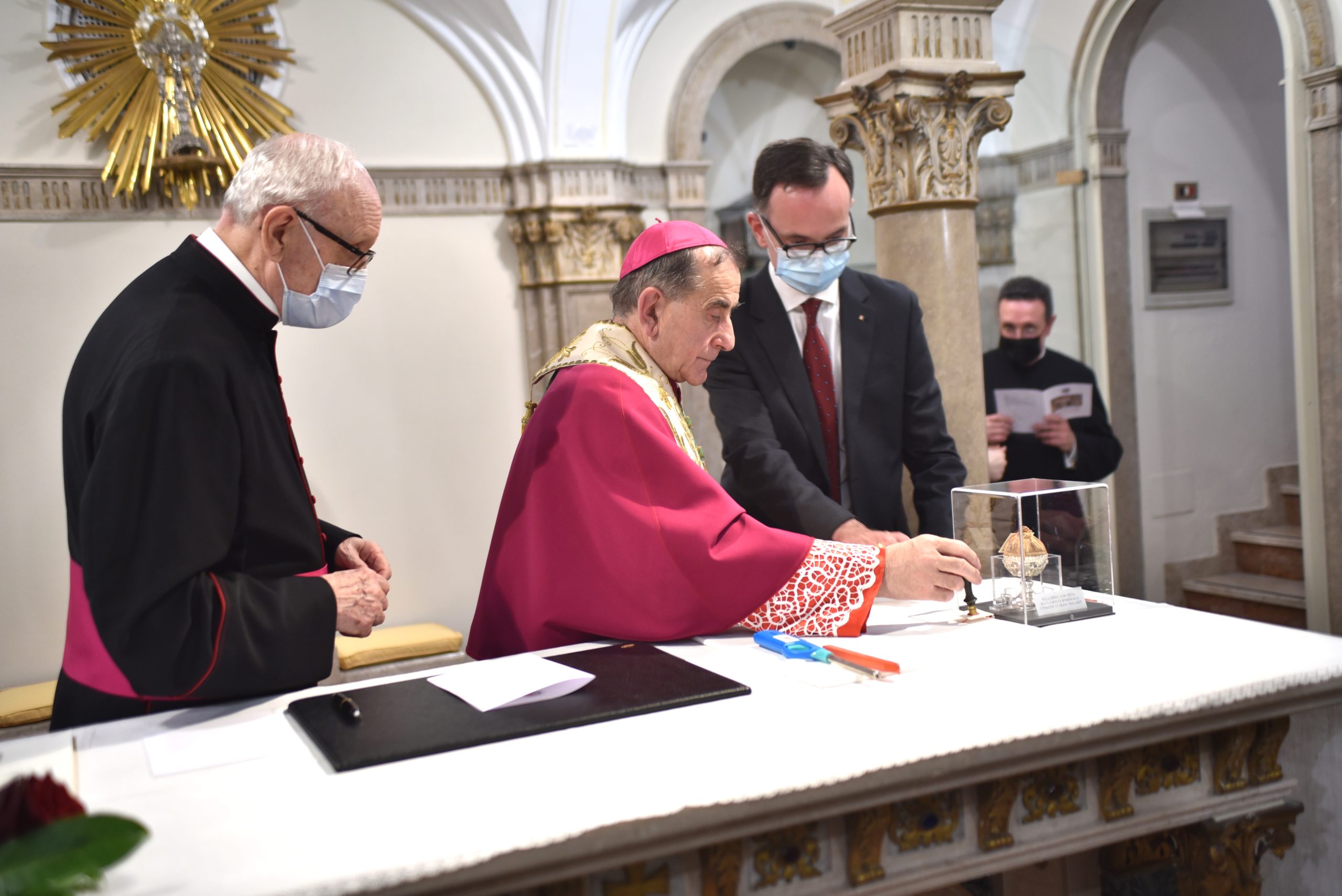L’Arcivescovo ha poi apposto il sigillo della Curia all’originale palla-sveglia plumbea che San Carlo teneva tra le mani per non assopirsi durante la preghiera e, infine, accompagnato dal segretario generale dello Zaccaria Emanuele Colombo, ha venerato le reliquie nella loro nuova collocazione, compiacendosi per il lavoro eseguito. Emulando San Carlo l’arcivescovo ha concluso la propria visita consumando il pranzo nel convento con i padri Barnabiti.