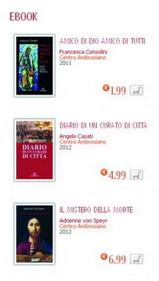 Anche Itl, casa editrice della Diocesi di Milano, ha deciso di varare una linea digitale. Da alcune settimane, infatti, è possibile acquistare i volumi del Centro Ambrosiano anche in formato elettronico. Al momento sono già più di una trentina i titoli disponibili sulle librerie on line nei formati più diffusi, sia ePub sia pdf. È quindi finalmente possibile leggere le pubblicazioni dell’editore ambrosiano su tutti i reader in commercio, iPad compreso.
