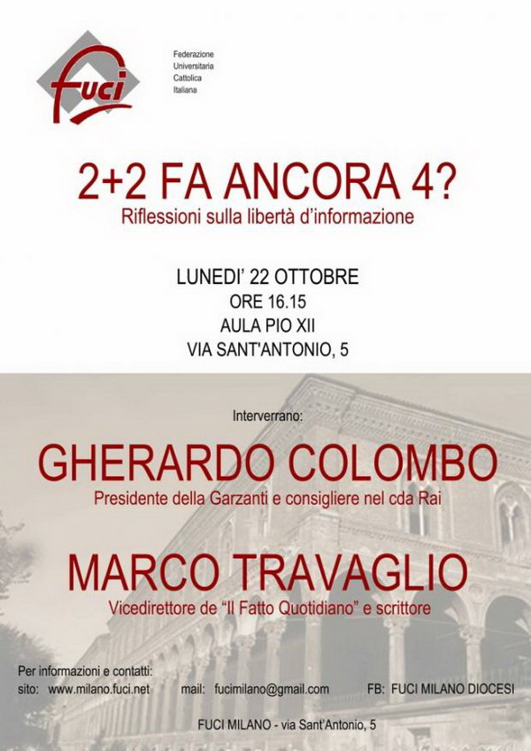 Ottocento giovani universitari il pomeriggio di lunedì 22 ottobre hanno colmato l’aula Pio XII di via S.Antonio 5, che da parecchio tempo non conosceva un incontro culturale così partecipato. Argomento scelto dal gruppo FUCI diocesano per l’incontro è stato la libertà di informazione. Un tema di strettissima attualità, ultimamente passato un po’ in secondo piano nel dibattito culturale e politico a causa della congiuntura economico-finanziaria e di crisi dello Stato che sta travolgendo tutto il vecchio continente. Tuttavia è riemerso di recente riguardo al cosiddetto “caso Sallusti”, caduto sotto l’azione di una legge molto discussa.