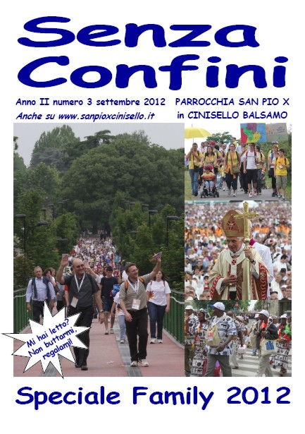 Family 2012, con la tre giorni milanese di Benedetto XVI, continua a echeggiare nelle parrocchie ambrosiane nei modi più diversi. Fra le tante iniziative segnaliamo lo “speciale” dedicato all’evento da Senza Confini, periodico della parrocchia di San Pio X in Cinisello Balsamo. In anteprima sull’edizione a stampa, che sarà distribuita in settembre, è già disponibile on line la versione elettronica.