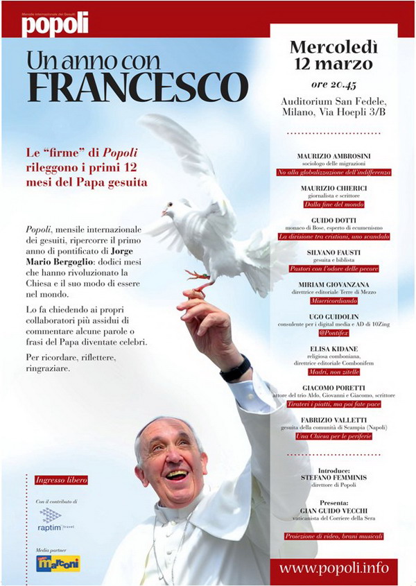 «Tiratevi i piatti, ma poi fate pace». Parole di un Papa che un comico commenta. Ma non solo. A Milano la sera del 12 marzo nove «firme» del mensile internazionale dei gesuiti Popoli, tra cui Giacomo Poretti (che insieme ad Aldo e Giovanni compone un famoso trio, curatore di una rubrica fissa sulla rivista), rileggono alcune frasi spiazzanti del primo Papa gesuita e latinoamericano della storia della Chiesa.