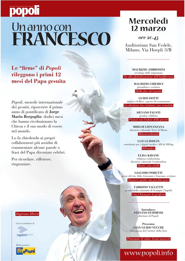 Il suo linguaggio, fresco e diretto, a volte rivoluzionario, trasmette messaggi che arrivano a tutti, credenti e non. Ricordando i dodici mesi trascorsi da quella sera piovosa del 13 marzo 2013, quando all’Habemus papam abbiamo conosciuto Jorge Mario Bergoglio, dal palco dell’Auditorium San Fedele di Milano (via Hoepli 3/B), a partire dalle 20.45, il vaticanista del Corriere della sera Gian Guido Vecchi presenta i protagonisti di una serata speciale che ripercorrono, con brevi letture e video, parole e frasi diventate celebri.