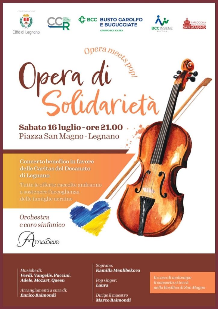 La musica diventa motivo di accoglienza delle famiglie ucraine. È in programma sabato 16 luglio, con inizio alle 21 in piazza San Magno a Legnano, «Opera di Solidarietà», concerto benefico promosso dalla Bcc di Busto Garolfo e Buguggiate, dal Circolo Culturale e Ricreativo, da Bcc Insieme Mutua e dalla parrocchia di San Magno con il patrocinio del Comune di Legnano (vedi qui la locandina). Destinatarie di questa edizione sono le Caritas del Decanato di Legnano per sostenere le iniziative di accoglienza delle persone fuggite dal conflitto in Ucraina.