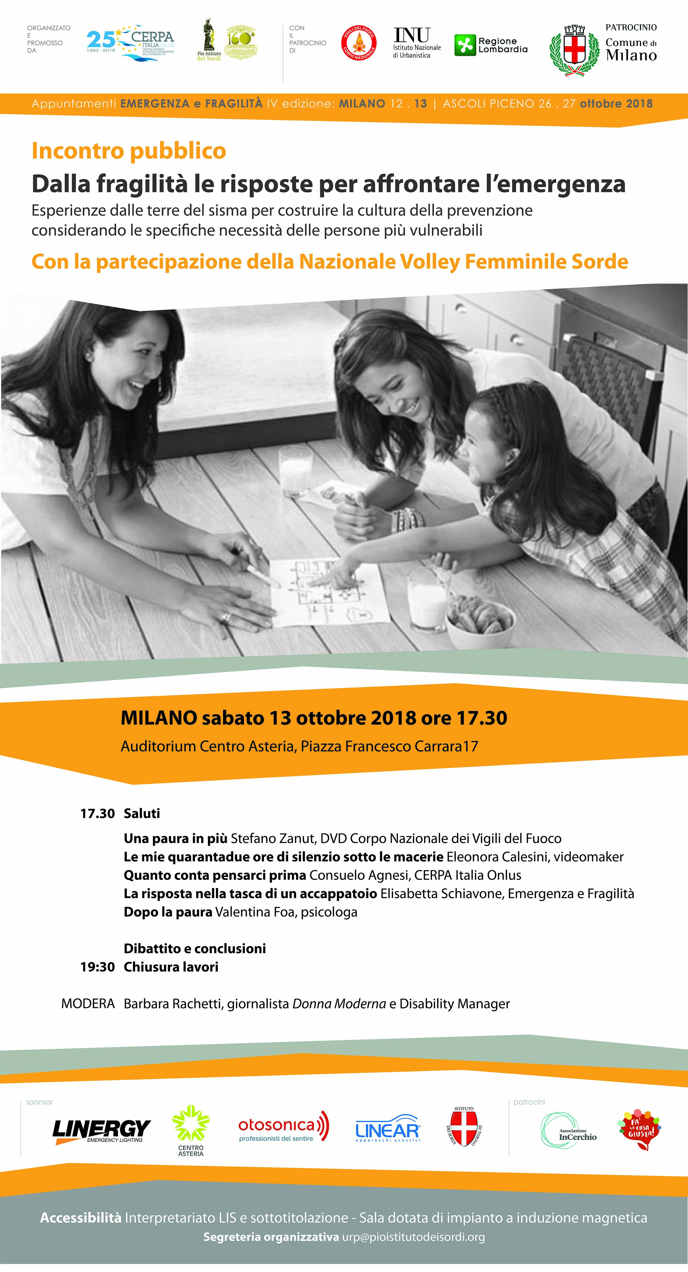 17.30: «Dalla Fragilità le risposte per affrontare l’emergenza»; incontro pubblico per riflettere sull’importanza del coinvolgimento delle persone con disabilità nell’elaborazione di soluzioni dedicate alle specifiche necessità in emergenza, con gli obiettivi di offrire strumenti per rispondere a situazioni di emergenza e migliorare la pianificazione delle attività della macchina dei soccorsi. Modera Martina Gerosa (Disability & Case Manager, PIS).