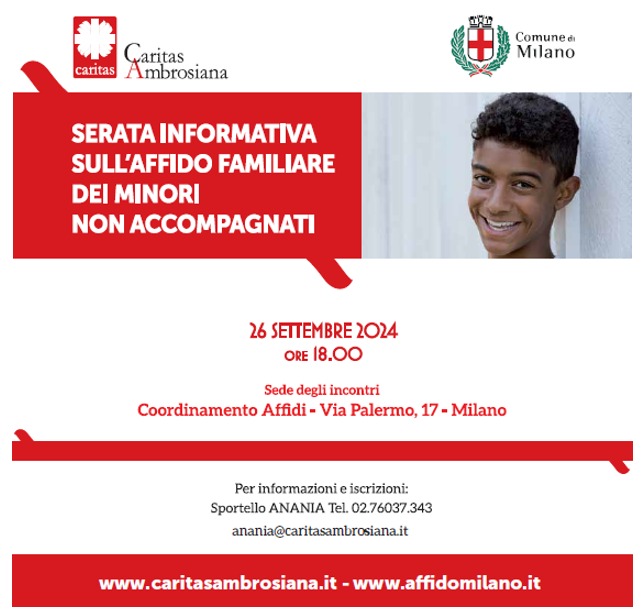 Per affrontare tutti i risvolti di questo impegno, lo Sportello Anania, promosso da Caritas Ambrosiana e dal Comune di Milano, organizza per giovedì 26 settembre (alle 18, presso il Coordinamento affidi di via Palermo 17) un incontro informativo sull’affido famigliare dei minori non accompagnati (vedi qui la locandina). A un’introduzione teorica, seguirà la proposta di esperienze di persone e famiglie che, concretamente coinvolte nel progetto «Accoglienza famigliare per adolescenti migranti soli», hanno aperto le porte delle loro case.