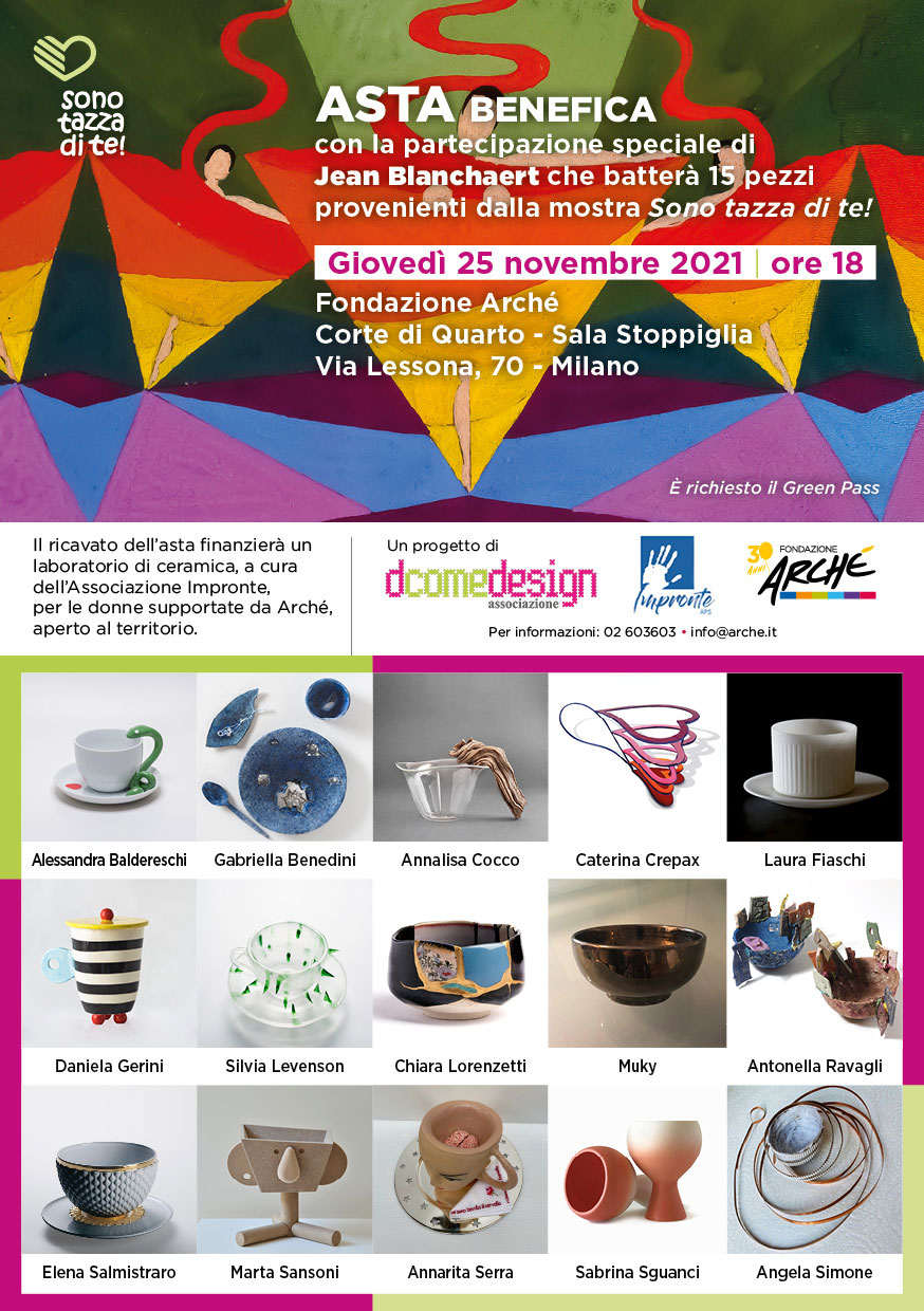 Il ricavato finanzierà, infatti, un laboratorio di ceramica al femminile a cura dell’Associazione Impronte di Nova Milanese. Alla presenza del famoso gallerista e critico d’arte Jean Blanchaert, i presenti potranno scegliere tra gli straordinari quindici pezzi da collezione, realizzati da Alessandra Baldereschi, Gabriella Benedini, Annalisa Cocco, Caterina Crepax, Laura Fiaschi, Daniela Gerini, Silvia Levenson, Chiara Lorenzetti, Muky, Antonella Ravagli, Elena Salmistraro, Marta Sansoni, Annarita Serra, Sabrina Sguanci, Angela Simone. Donne progettiste – designer, artiste, architette e non solo – che hanno messo a disposizione il loro estro e le loro abilità per rendere anche una semplice tazza un oggetto unico e da collezione, offrendo al contempo nuove opportunità alle donne in difficoltà accolte e sostenute da Arché.