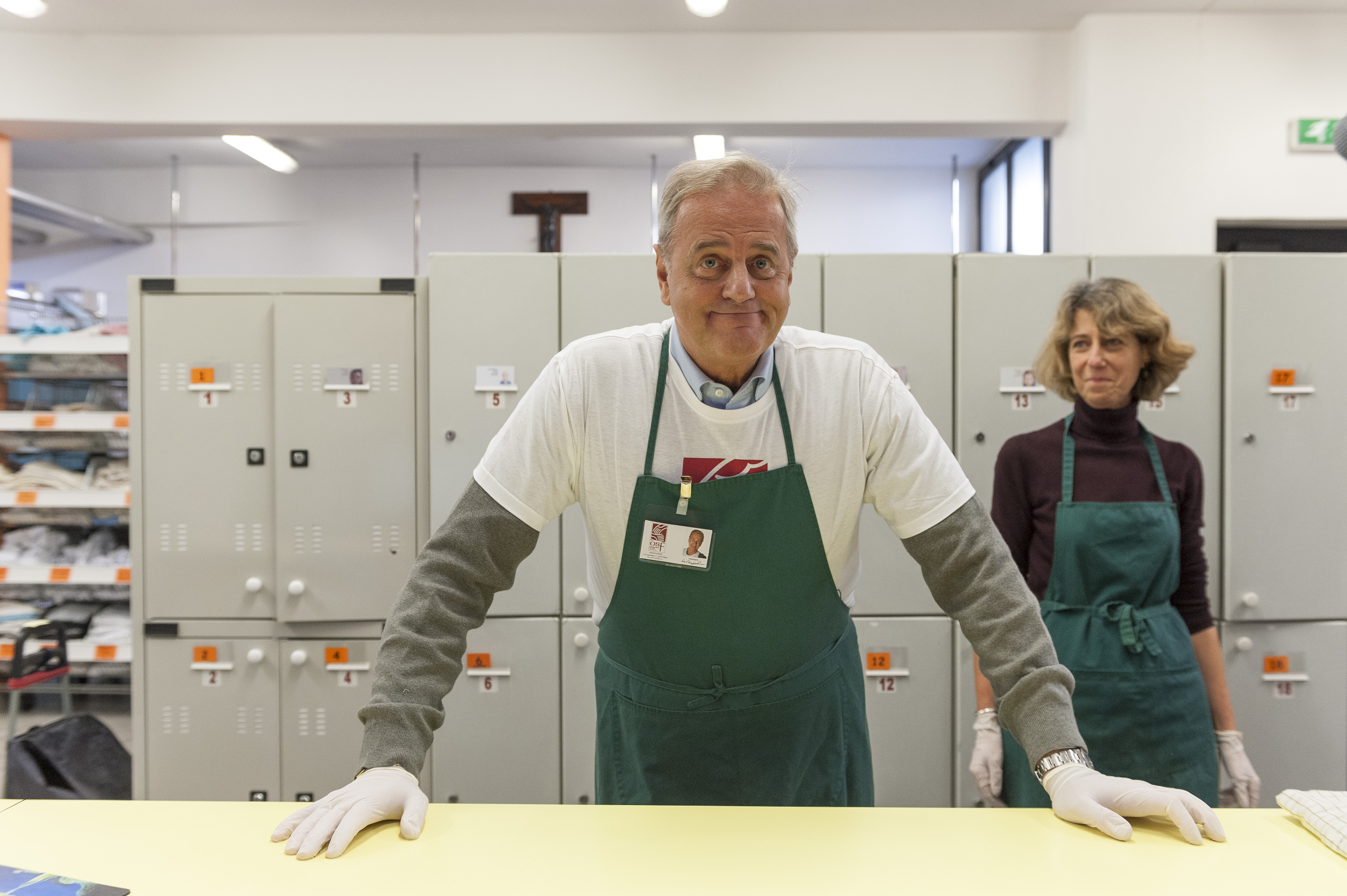 Bertolino ha conosciuto tutti i suoi colleghi di turno, indossato come loro il grembiule verde dei volontari del servizio di Osf, il badge, e ha svolto le mansioni che gli sono state assegnate, aiutando concretamente ospiti italiani e stranieri, che come ogni giorno frequentano numerosi le Docce e il Guardaroba di Opera San Francesco. Ha registrato gli accessi nel sistema informatico, consegnato agli ospiti il kit di biancheria pulita per la doccia, proposto gli indumenti a chi aveva bisogno di un cambio d’abito. Terminato il servizio si è poi recato a visitare la Mensa di corso Concordia dove ogni giorno mangiano quasi 2.500 persone.