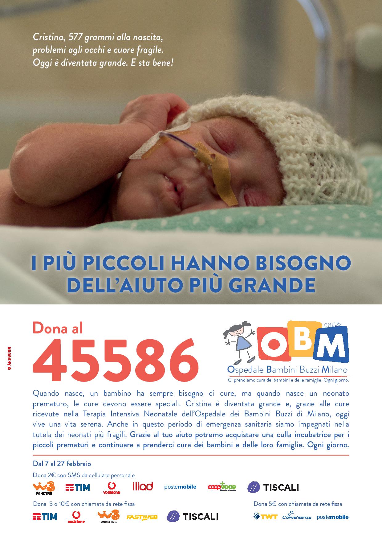 Questo sdoppiamento ha di fatto moltiplicato il bisogno di attrezzature e dotazioni tecnologiche, in particolare per la Patologia Neonatale. Per questo dal 7 al 27 febbraio Obm Onlus lancia la campagna di raccolta fondi «Nascere al tempo del Covid», con numero solidale 45586. Il valore della donazione sarà di 2 euro per ciascun sms inviato a questo numero e di 5 o 10 euro per ciascuna chiamata da rete fissa. I fondi raccolti serviranno per acquistare incubatrici, culle speciali e saturimetri in grado di monitorare lo stato di salute dei piccoli prematuri, curarli e crescerli al meglio.