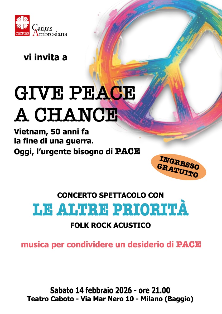 Molte persone (attivisti, artisti, semplici cittadini) hanno però promosso, e continuano a sostenere, movimenti pacifisti che cercano di svegliare le coscienze. Anche grazie al linguaggio della musica, planetario mezzo di condivisione del desiderio di pace. In Give peace a chance. Vietnam, 50 anni fa la fine di una guerra. Oggi, l’urgente bisogno di pace, il gruppo folk-rock acustico «Le Altre Priorità» propone un percorso musicale costituito da alcune delle più celebri canzoni che, dagli anni Sessanta a oggi, hanno contribuito alla universale condivisione del desiderio di pace.