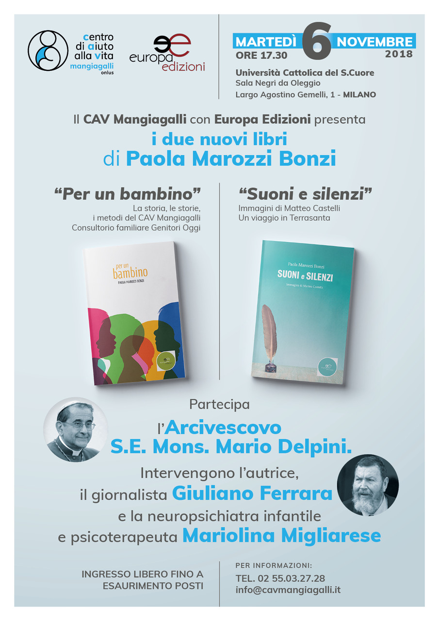 Paola Bonzi parlerà del libro Per un bambino (Europa Edizioni, 246 pagine, 14,90 euro) dedicato alla storia del Cav Mangiagalli, insieme al giornalista Giuliano Ferrara e alla neuropsichiatra infantile Mariolina Migliarese. Monsignor Delpini commenterà invece Suoni e silenzi (Europa Edizioni, con immagini di Matteo Castelli (98 pagine, 9,90 euro), quaderno di un viaggio in Terra Santa.