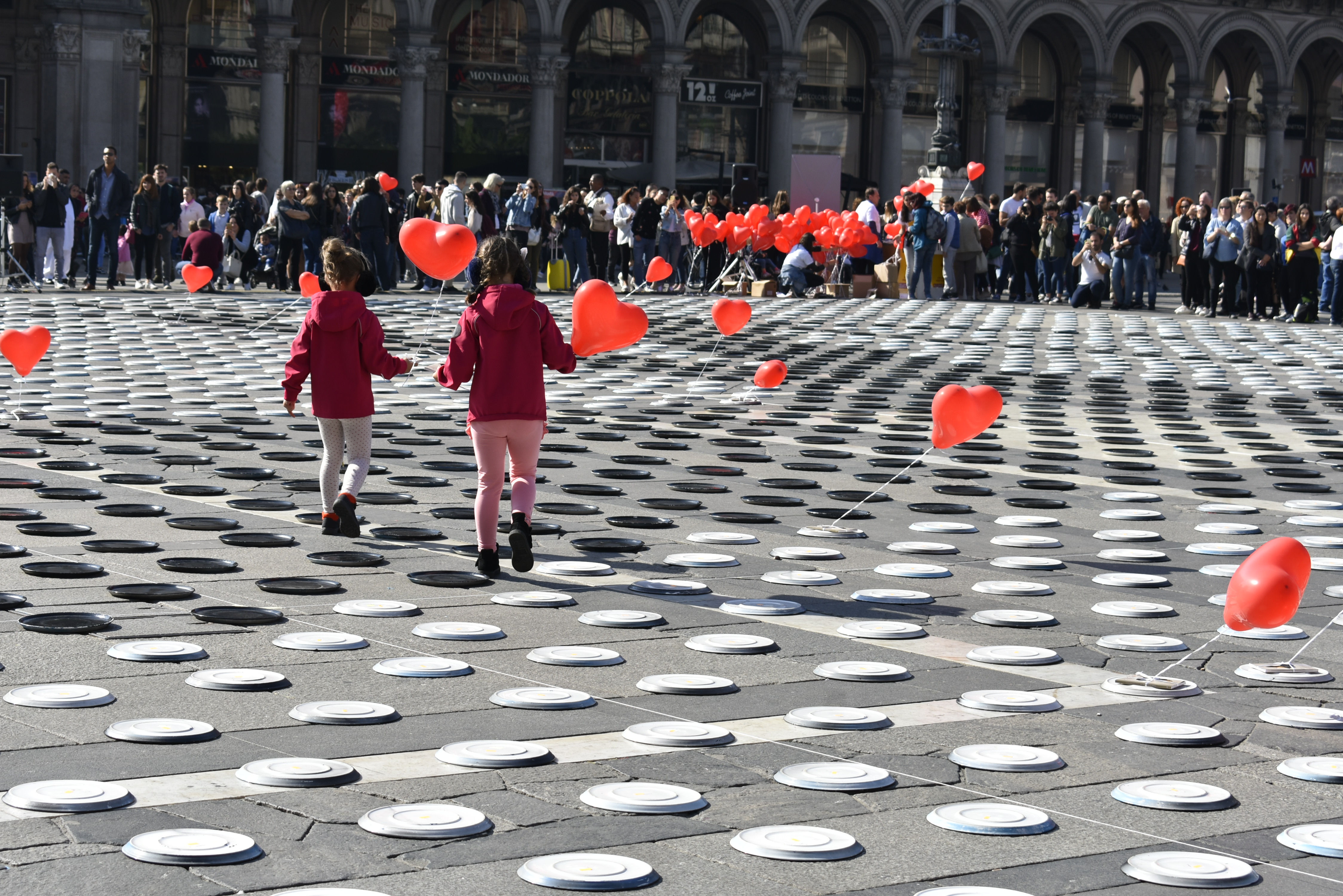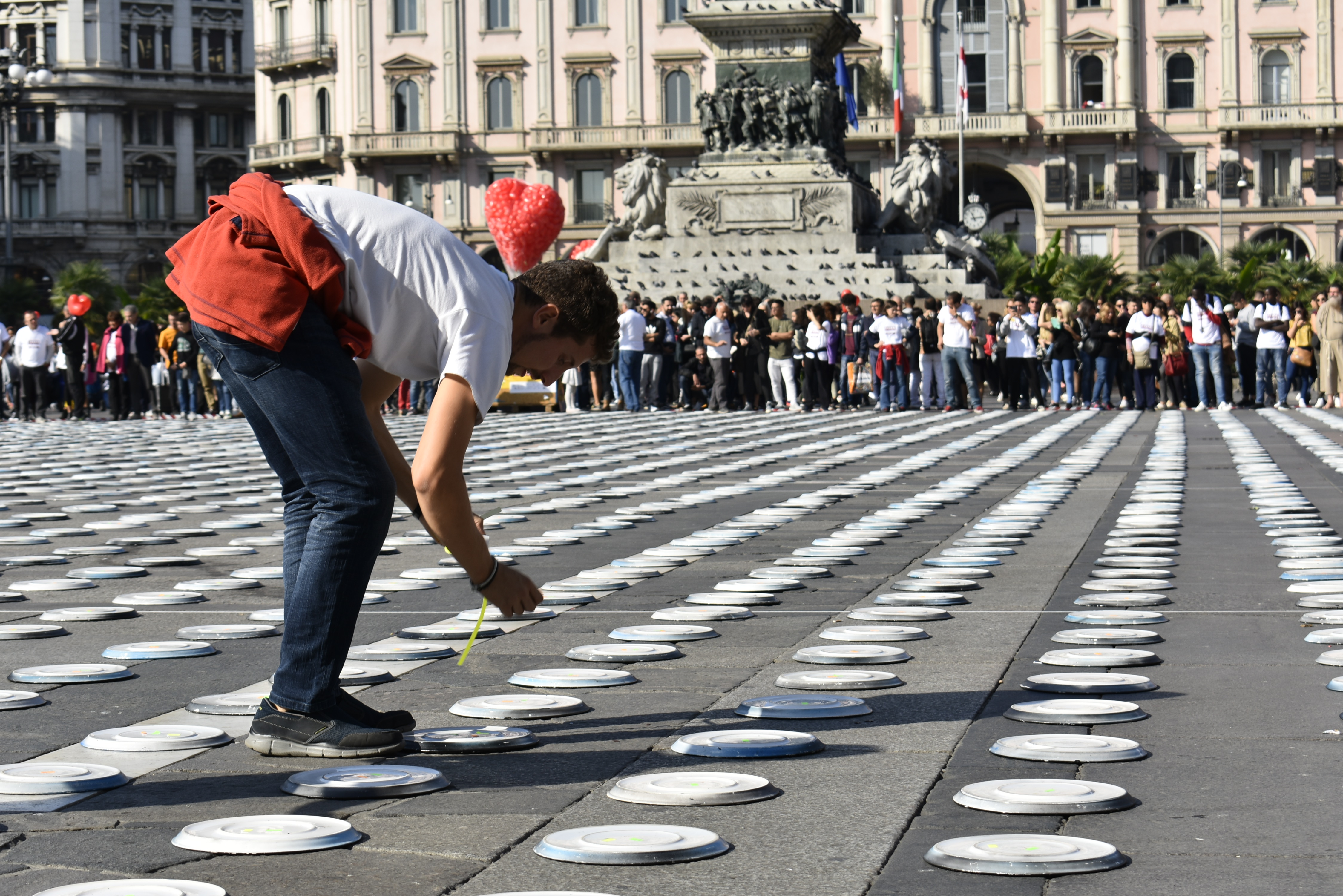 Cefa Onlus ha messo in scena la più grande performance di pixel art urbana partecipata e solidale mai allestita prima. Piazza Duomo, con i suoi 17 mila metri quadrati di superficie, si è trasformata in una grande “tavola della solidarietà” apparecchiata con 10 mila piatti bianchi, vuoti, per ricordare che ancora oggi troppe persone non hanno accesso al cibo. Grazie alla collaborazione di volontari e persone comuni, i piatti a uno a uno sono stati capovolti per formare, dapprima, il disegno dell’Africa, poi quello di un libro da cui nasce una spiga – illustrazione ideata dal noto fumettista Francesco Tullio Altan – e, infine, la sagoma dell’Uomo vitruviano di Leonardo da Vinci, a sottolineare – proprio nel cinquecentenario della scomparsa del Genio- come l’educazione e lo studio, la formazione agricola e la conoscenza tecnica siano i mezzi fondamentali per sconfiggere la fame.