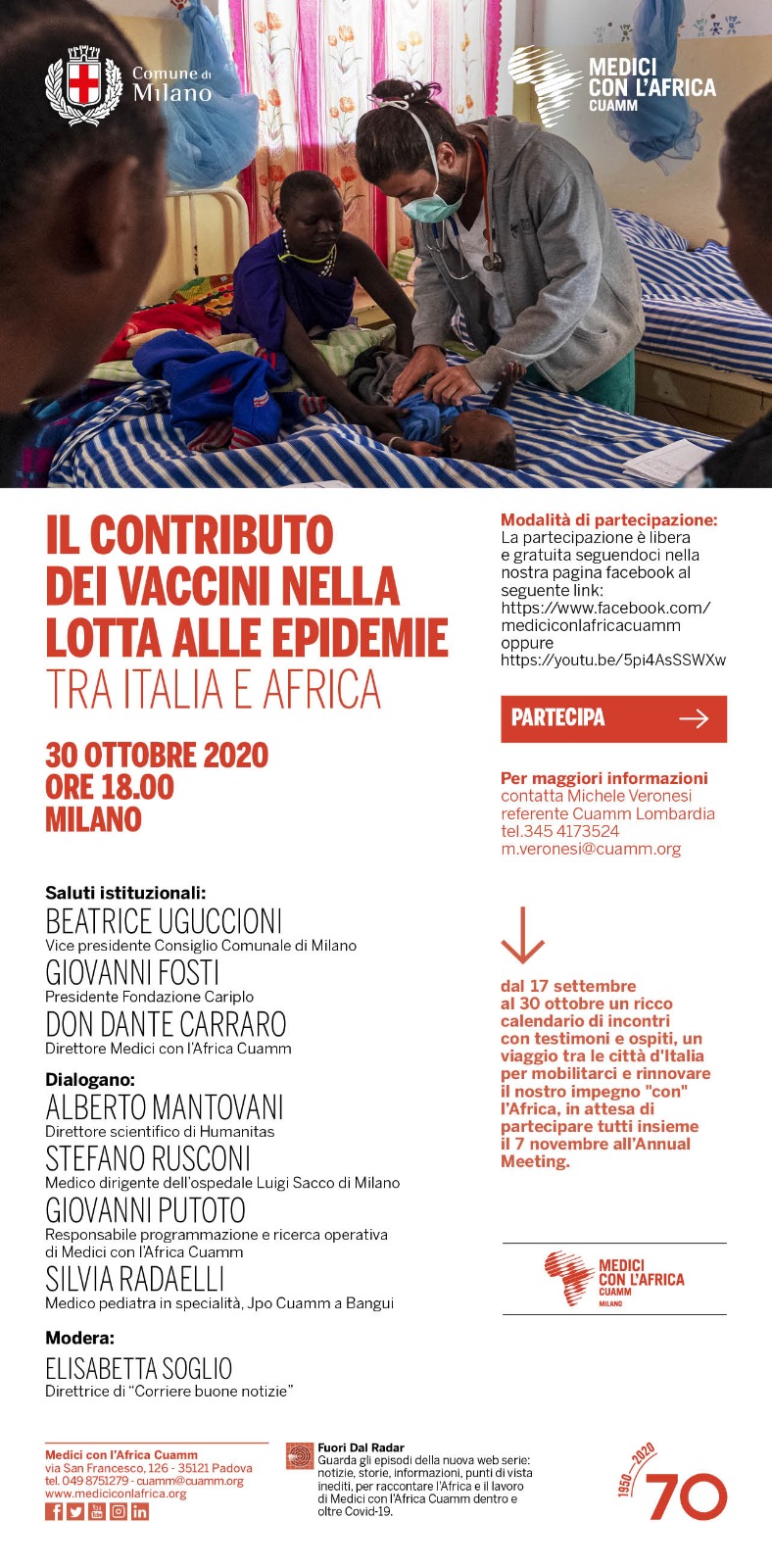 Un dialogo tra relatori di altissimo livello per riflettere sulle conseguenze di questo periodo. Interverranno tra gli altri Alberto Mantovani, direttore scientifico di Humanitas e tra i massimi esperti mondiali di immunologia, i medici del Cuamm Giovanni Putoto, Stefano Rusconi e Silvia Radaelli, che porteranno i loro contributi dalle esperienze di questi mesi, e il direttore di Cuamm don Dante Carraro. Modera Elisabetta Soglio, direttrice di Buone notizie del Corriere della sera.