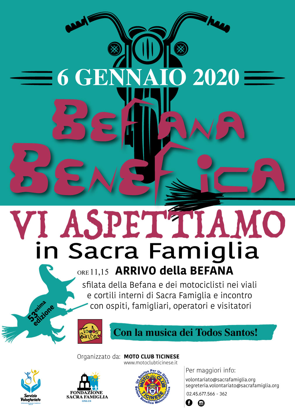 La manifestazione, organizzata dal Moto Club Ticinese “Raul Mondini”, ha una lunga e curiosa storia alle spalle: nasce, infatti, dall’iniziativa di un piccolo gruppo di soci del Club che erano soliti consegnare doni ai figli dei vigili urbani nei crocevia delle strade milanesi. Successivamente si decise di estendere questa tradizione anche ad altre realtà del territorio, tra cui Sacra Famiglia: è iniziata così un’appassionata amicizia, arricchita da momenti di condivisione e collaborazione, come in una vera famiglia. Oltre alla straordinaria partecipazione dei motociclisti, da parte del Moto Club non sono mai mancati la sensibilità e il rispetto per gli ospiti, che considerano la Befana Benefica un evento irrinunciabile.
