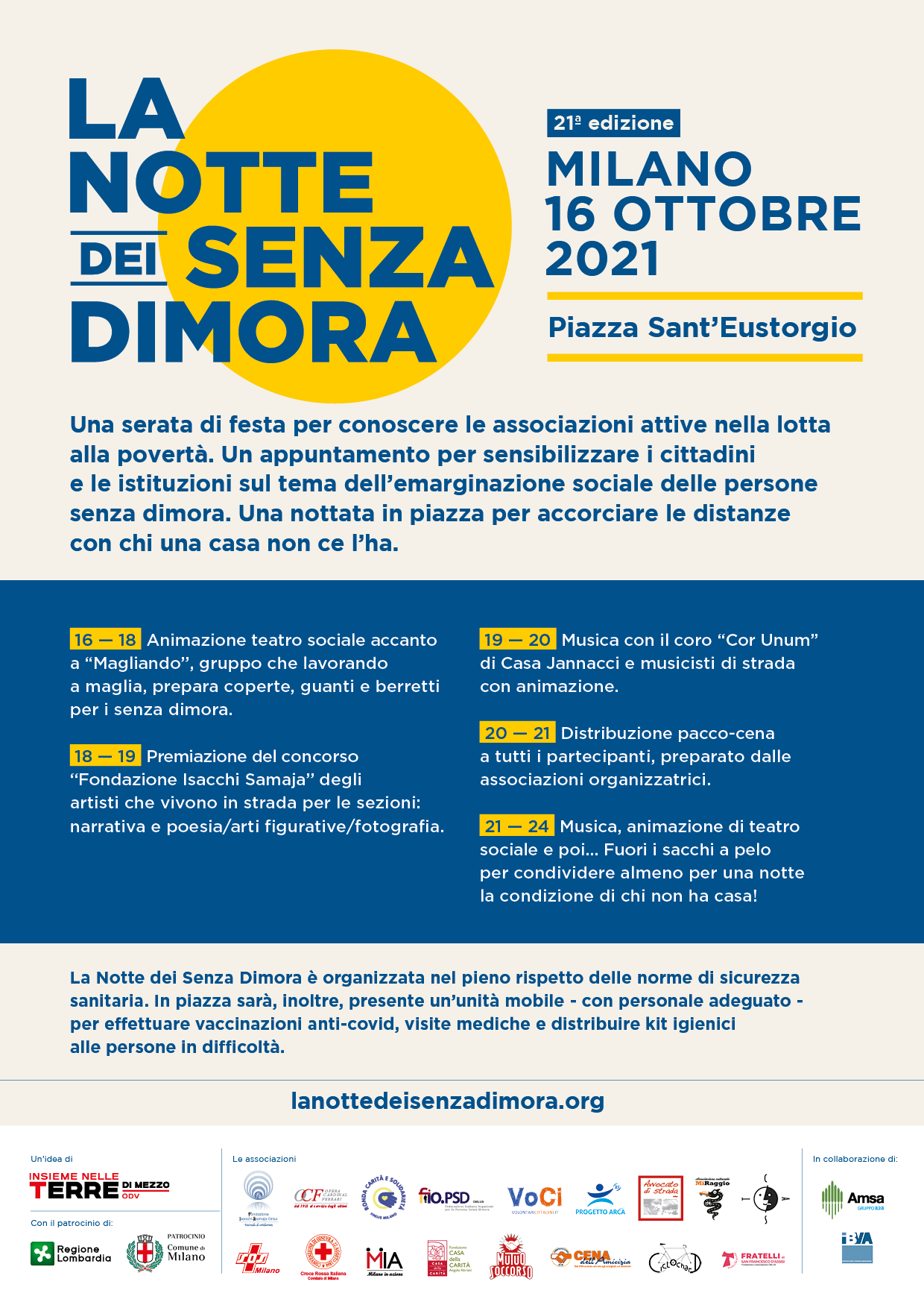 Sabato 16 ottobre, in piazza Sant’Eustorgio a Milano, si svolgerà la ventunesima edizione de La Notte dei Senza Dimora. La tradizionale iniziativa, organizzata da una ventina di associazioni ed enti che si occupano di grave emarginazione, torna in piazza, dopo la sospensione causa Covid-19 del 2020. Lo scopo è quello di sensibilizzare i cittadini e le istituzioni sulla condizione di povertà ed emarginazione sociale delle persone senza dimora, aggravata proprio dalla pandemia.