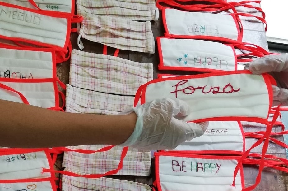 Forza, coraggio, be happy: sono parole positive e di incoraggiamento quelle ricamate a mano sulle mascherine confezionate dalle donne vittima di violenza e sfruttamento ospiti di Fondazione Somaschi Onlus e distribuite alle persone senza fissa dimora nel centro diurno Drop-in di piazza XXV Aprile, gestito dalla stessa onlus.