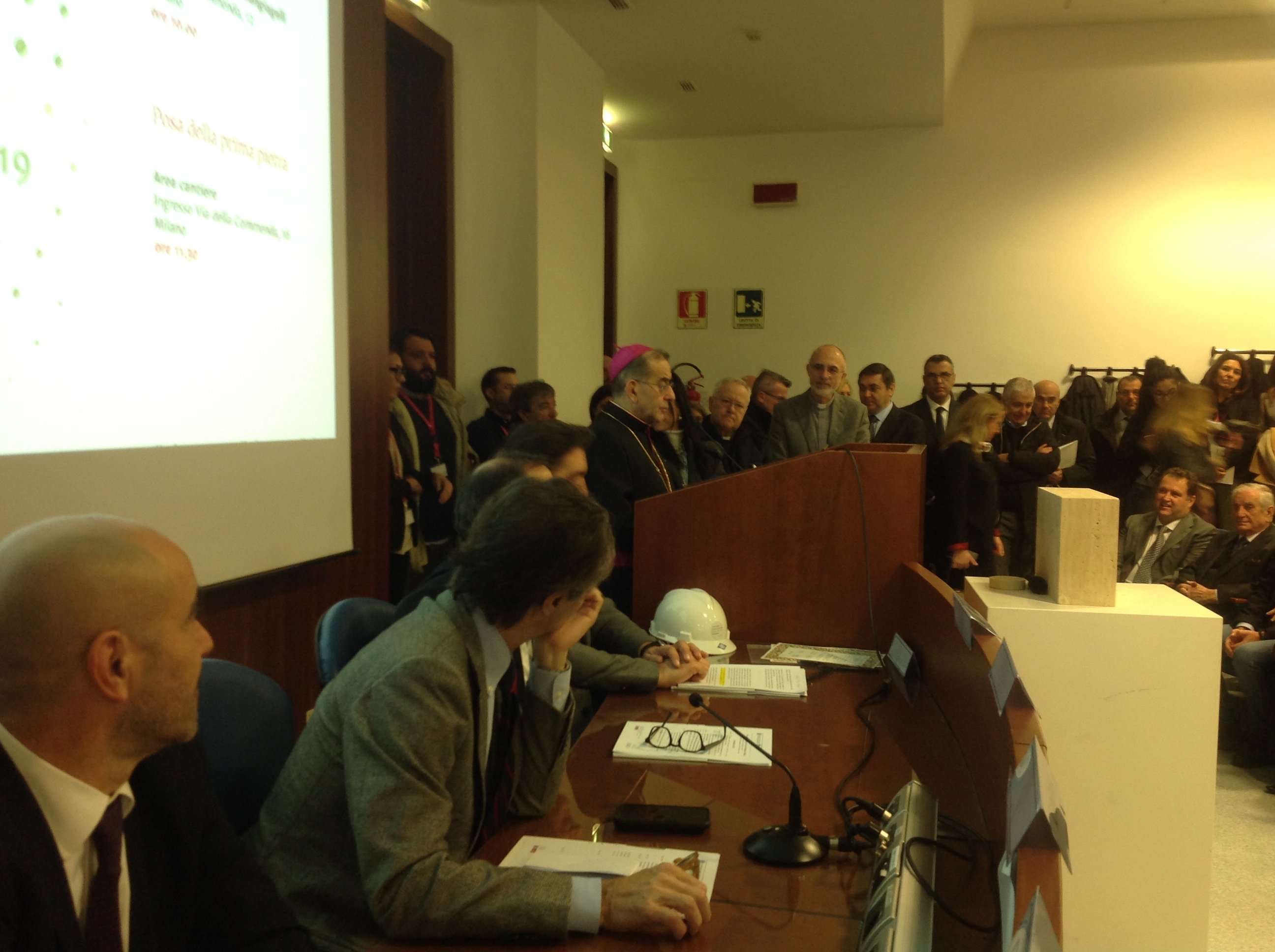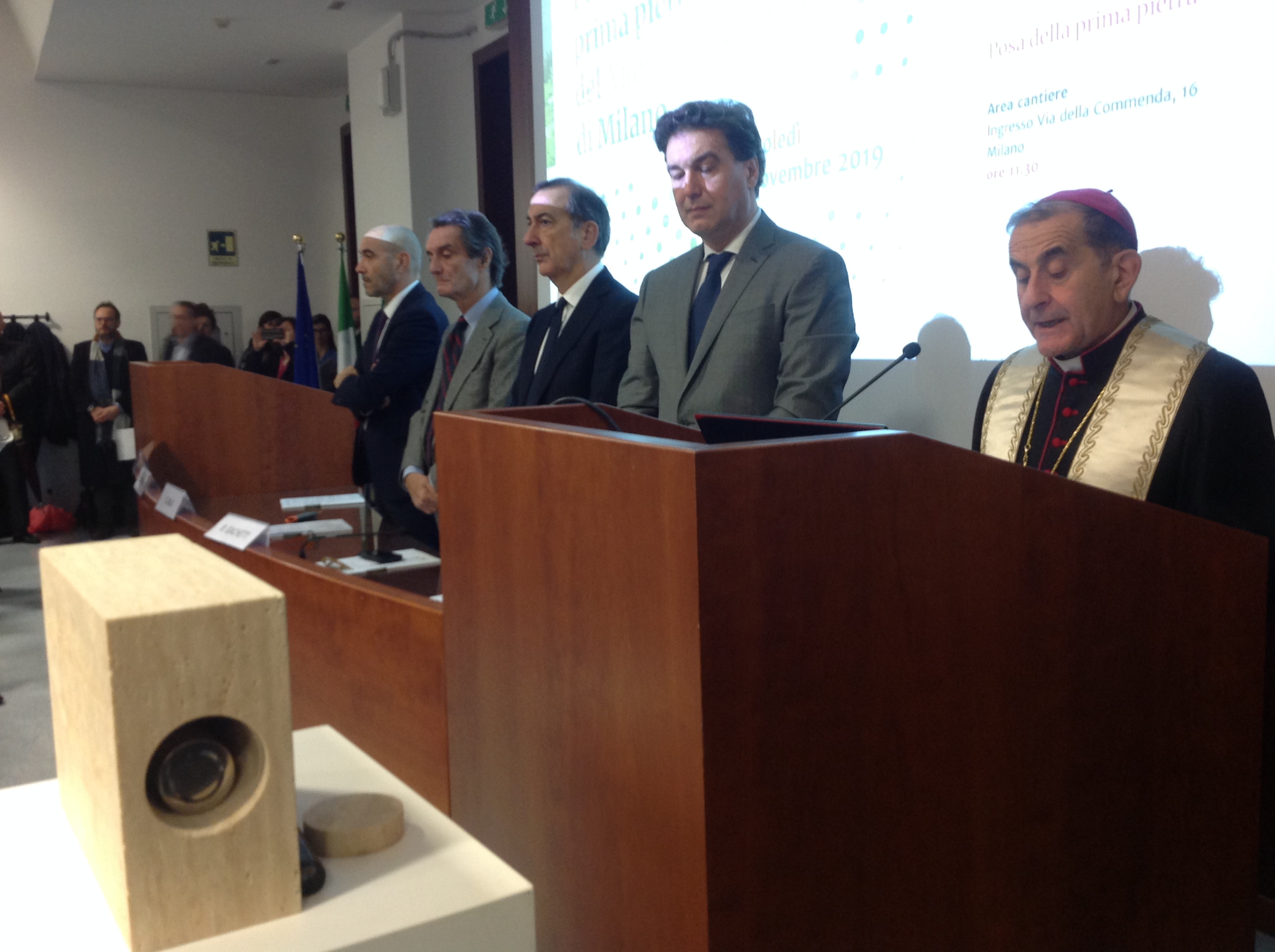 Nell'Aula magna della Mangiagalli la benedizione della prima pietra: «La presenza di Dio aiuti tutti coloro che qui lavorano e propizi un'alleanza di valori e di motivazioni nel sostenere questo progetto»