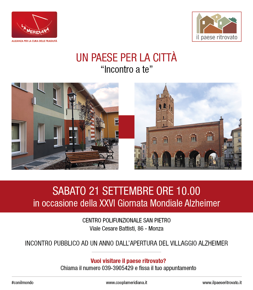 Sabato 21 settembre al Centro San Pietro di Monza (viale Cesare Battisti, 86), l’incontro pubblico «Un paese per la città», con la presentazione dei risultati del Paese Ritrovato e del nuovo progetto «Incontro a te», servizio innovativo per l’anziano a domicilio e di sostegno delle rete familiare. Sarà possibile prenotarsi per una visita alla cittadella che ospita persone con Alzheimer.