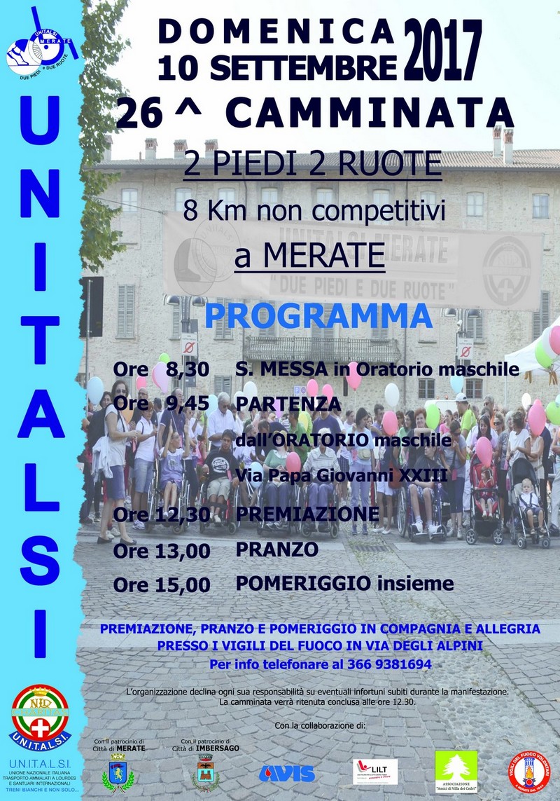 Il 10 settembre la Sottosezione di Merate dell’Unitalsi organizza la XXVI camminata “Due piedi e due ruote” per sensibilizzare al problema della disabilità.