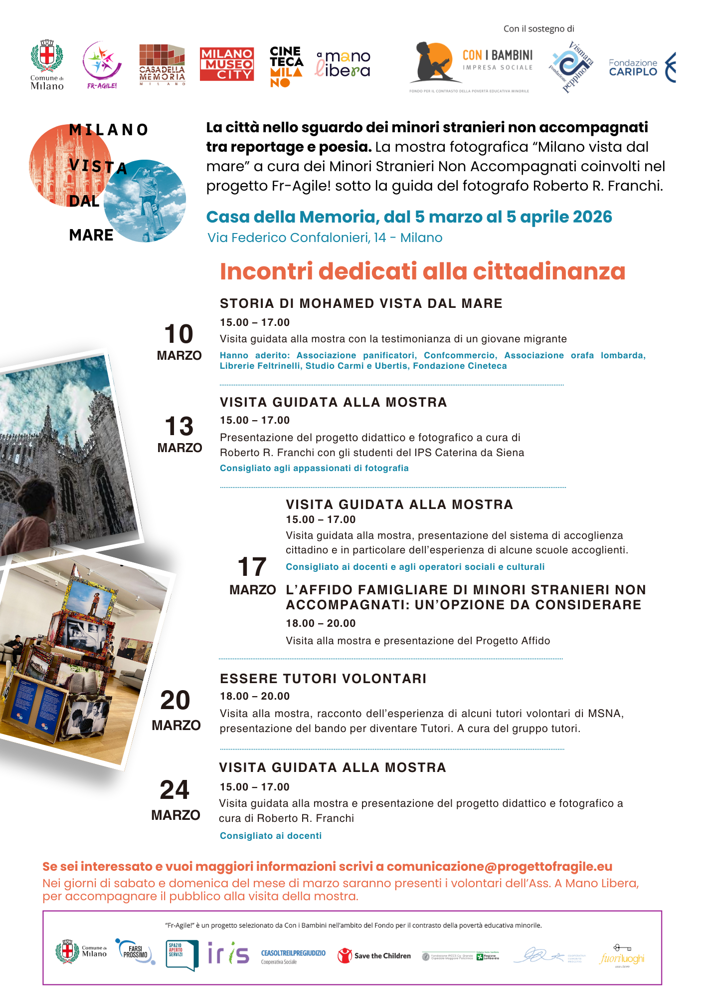 La mostra – a ingresso gratuito, curata dai Minori Stranieri Non Accompagnati (MSNA) coinvolti nel progetto Fr-Agile! sotto la guida del fotografo Roberto R. Franchi – è reduce dall’inaugurazione dello scorso 6 novembre a Palazzo Reale in occasione di BookCity. Una tappa fondamentale di un percorso itinerante, volto a far conoscere ai milanesi le storie, i sogni e le emozioni di questi ragazzi, trasformando i loro vissuti in un racconto visivo che unisce reportage e poesia.