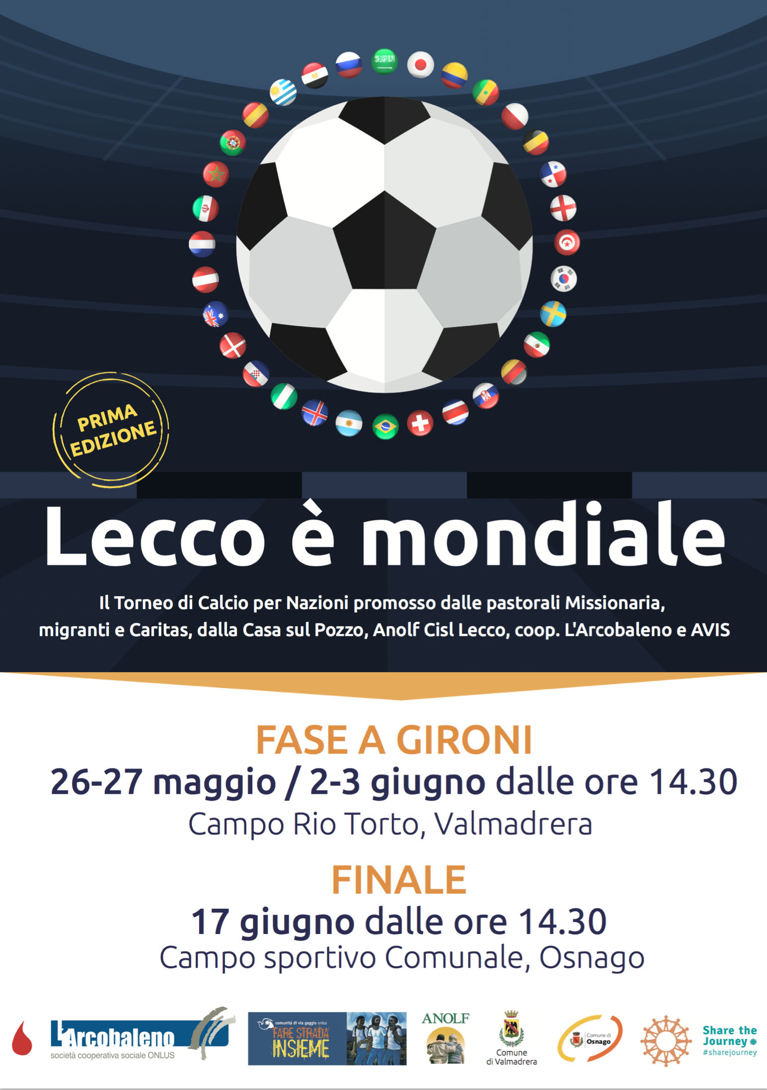 Inizierà sabato 26 maggio “Lecco è mondiale”, la prima edizione del torneo di calcio per Nazioni che coinvolgerà ragazzi migranti di varie nazionalità, ospiti nei diversi centri di accoglienza del territorio o residenti già da tempo in città. L’iniziativa coinvolgerà oltre 200 giocatori, suddivisi, in base alla nazionalità, in 12 squadre che si affronteranno divise in quattro gironi all’italiana da tre, in partite di sola andata.