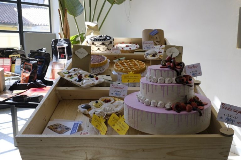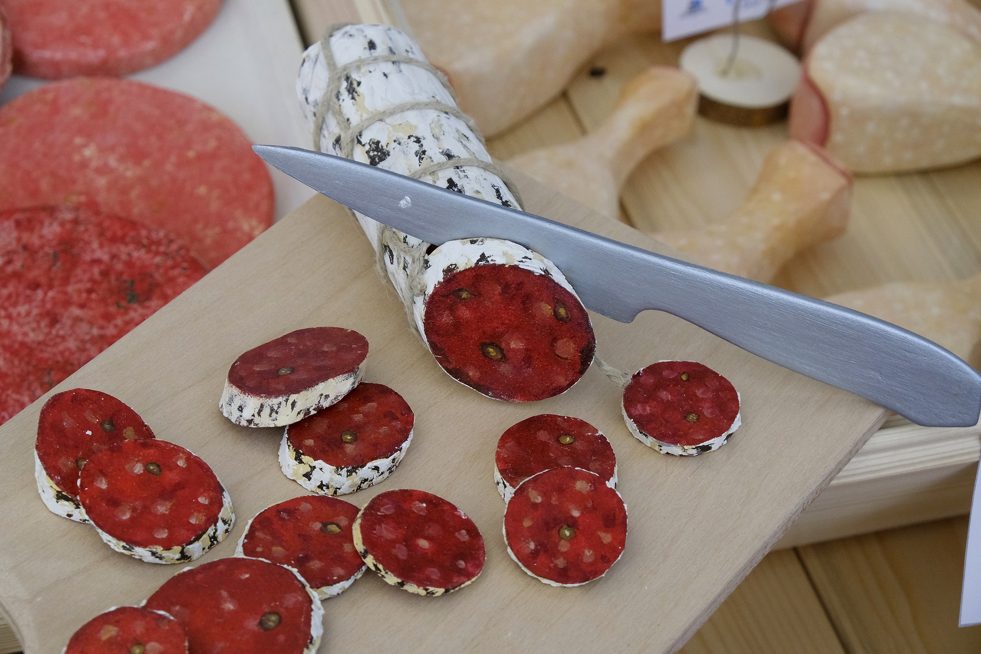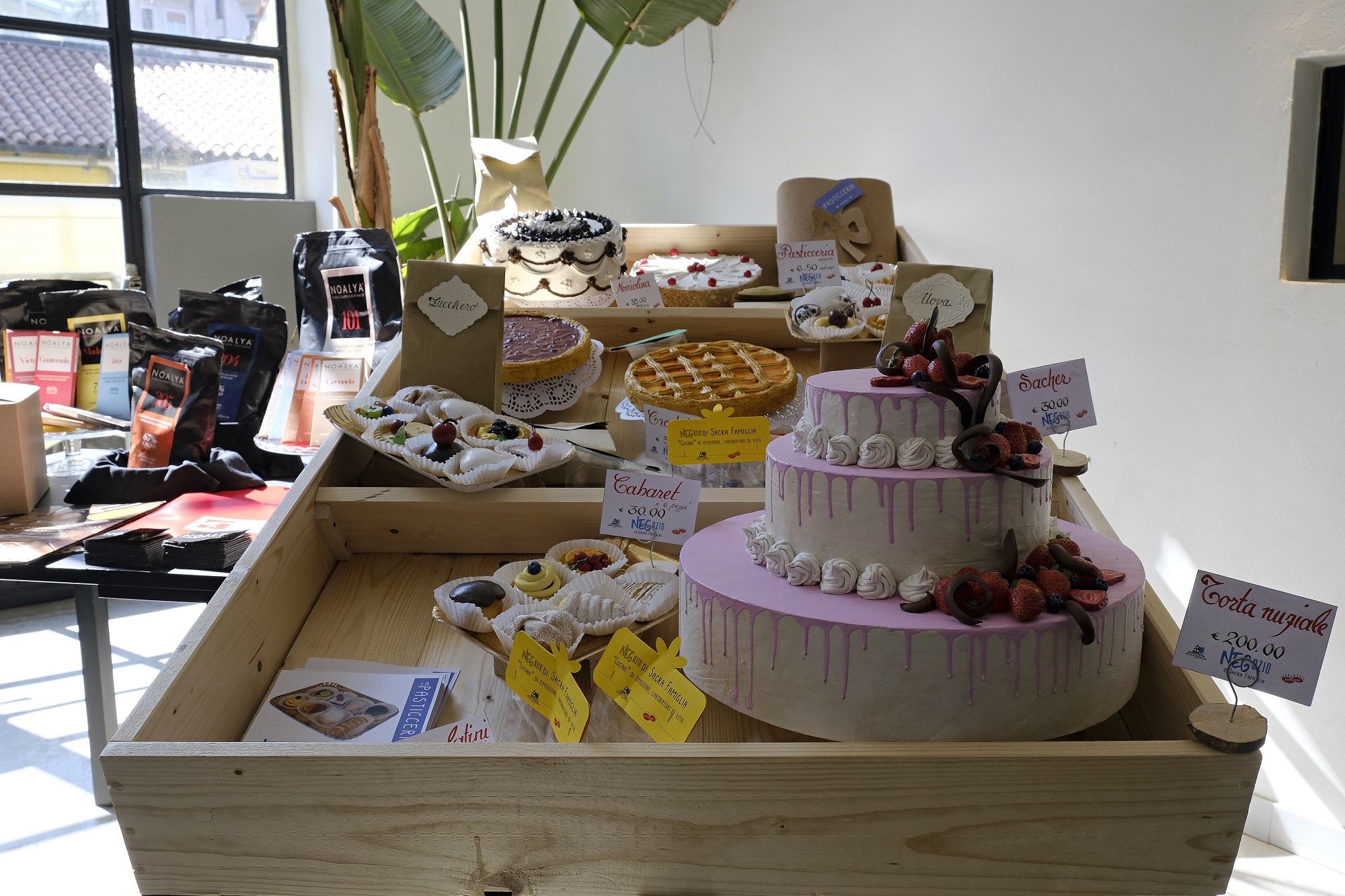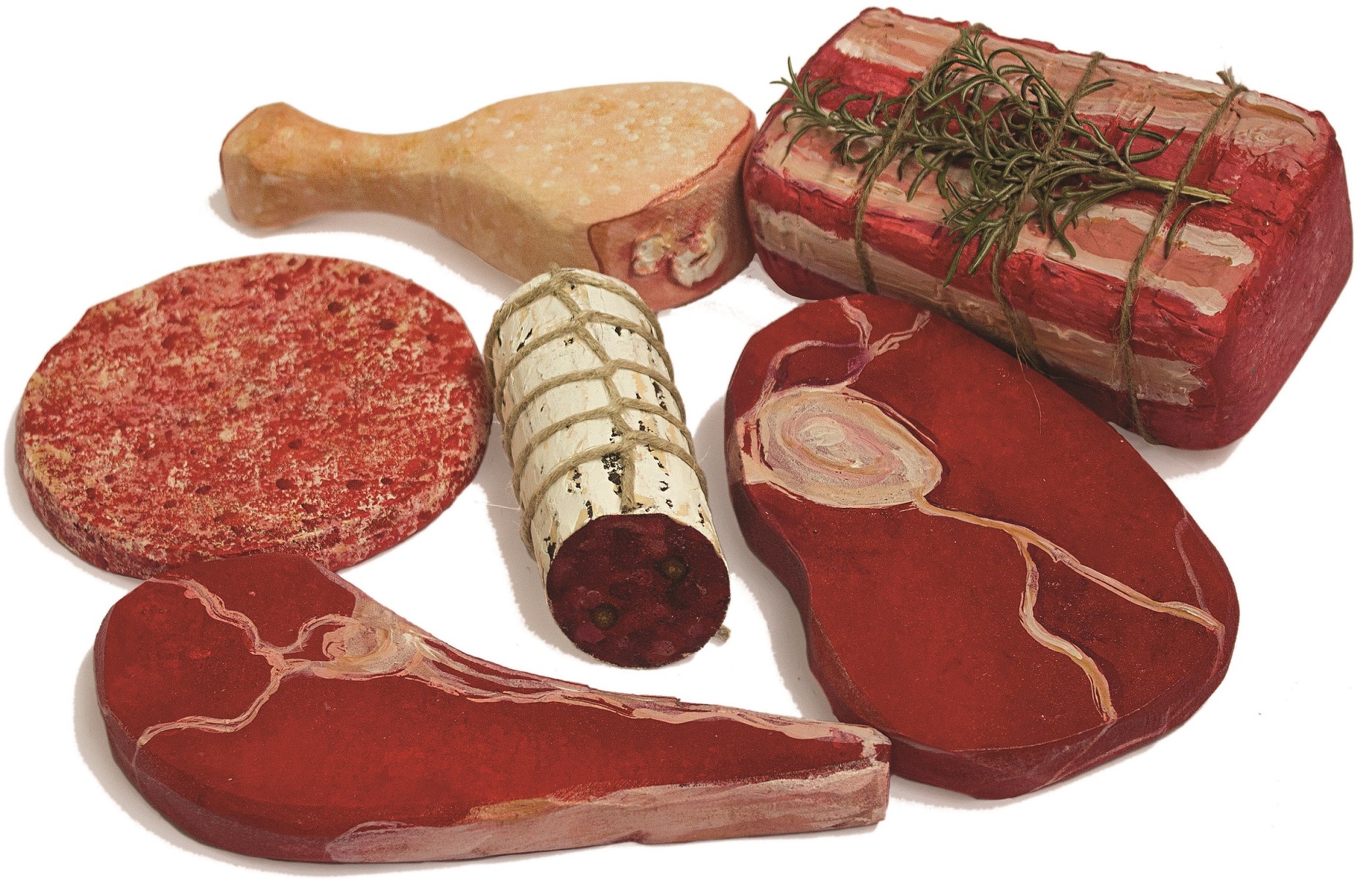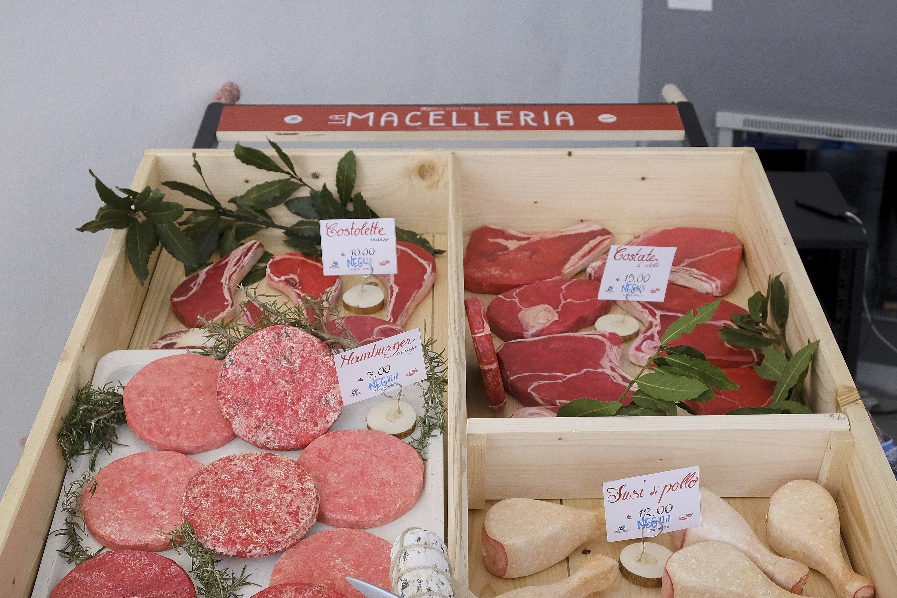 Quattro sono i “Neg-ozi” in mostra: macelleria, pasticceria, formaggiaio e coltelleria pieni di salami, bistecche, coltelli, formaggi e dolci prodotti in legno e ceramica, ma talmente simili al vero da far venire l’acquolina in bocca. Tanti oggetti che sembrano uguali ma, a guardarli bene, sono diversi l’uno dall’altro, perché ciascuno è un pezzo unico che verrà esposto su un carretto come se si trattasse di un vero negozio.