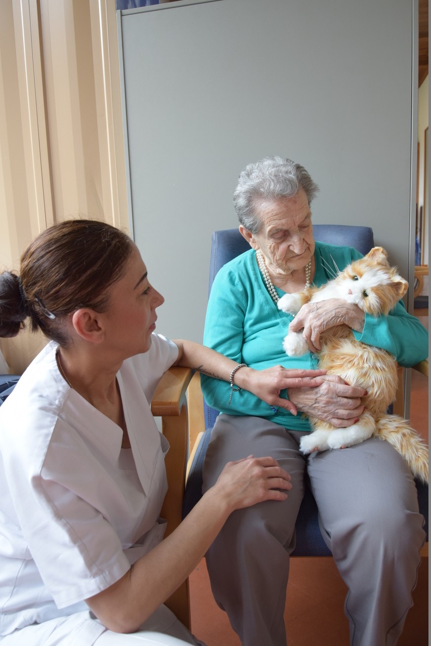 Queste terapie coinvolgono principalmente la figura della terapista occupazionale e hanno richiesto la realizzazione di ambienti di vita funzionali all’orientamento spaziale e procedurale delle persone fragili: una nursering per la doll therapy dotata di zona fasciatoio, abiti da neonato, passeggino e bambole e un angolo salotto per la robotic pet therapy con un gatto robotico e un’ambientazione realistica.