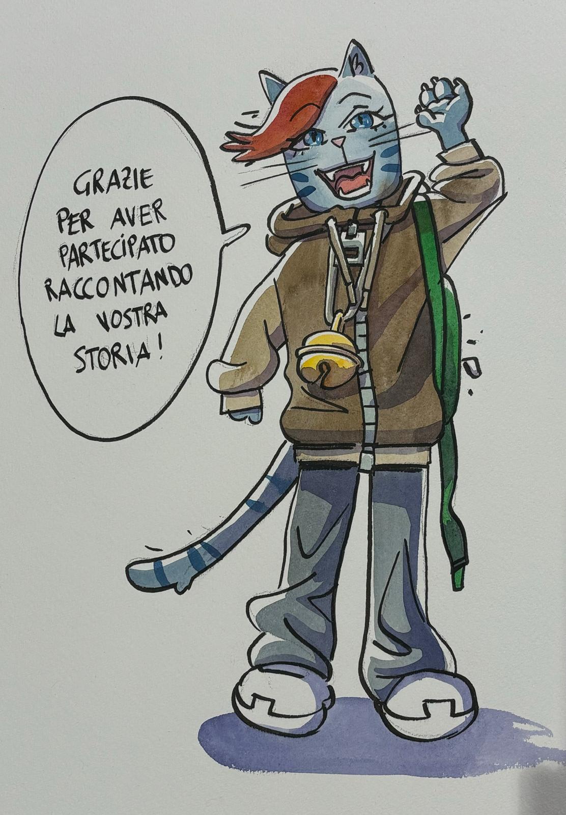 I due fumettisti che hanno partecipato e sono intervenuti nei primi incontri, Anwar e Zoe (Instagram: @anwar_e_zoe), confrontandosi con i referenti del progetto sin da quest’estate, hanno dato vita al protagonista dell’inedito fumetto: un gatto di nome Alex che si trasforma nei colori e nelle forme a seconda delle sue emozioni e di quello che gli capita.