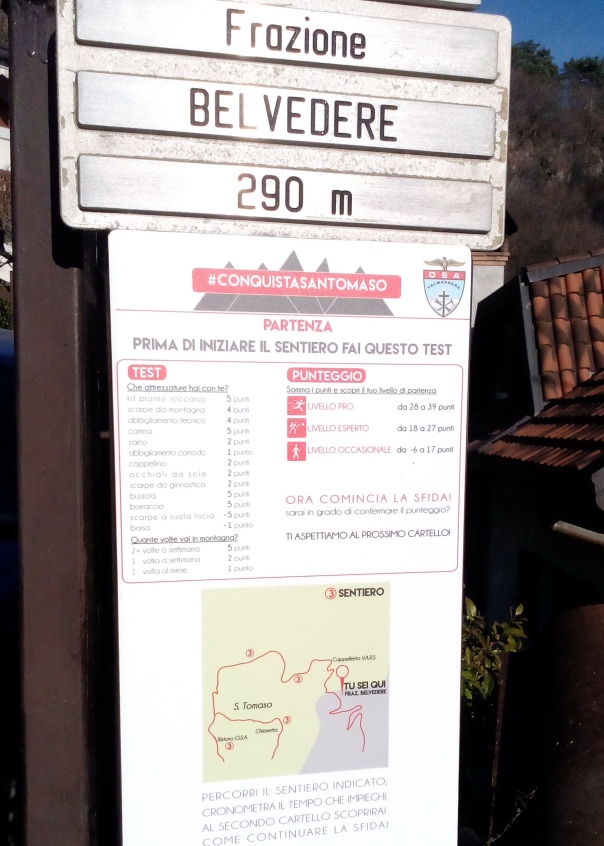 A Valmadrera (Lecco) sulla mulattiera per San Tomaso sono stati collocati tre nuovi cartelli segnaletici: uno all’avvio del sentiero in frazione Belvedere, un secondo alla cappellina Vars e un terzo all’ingresso di San Tomaso. Si affiancano alle storiche bandierine dell’Organizzazione sportiva alpinisti, rinnovandole grazie a un qr-code, il codice che, se inquadrato da un cellulare modello smartphone si collega al sito dove si trovano tutte le informazioni utili a un escursionista. Il sito potrà essere incrementato e magari altri sentieri saranno messi in rete con ulteriore segnaletica. Sui cartelli sono state riportate anche altre informazioni, compreso un simpatico quiz.