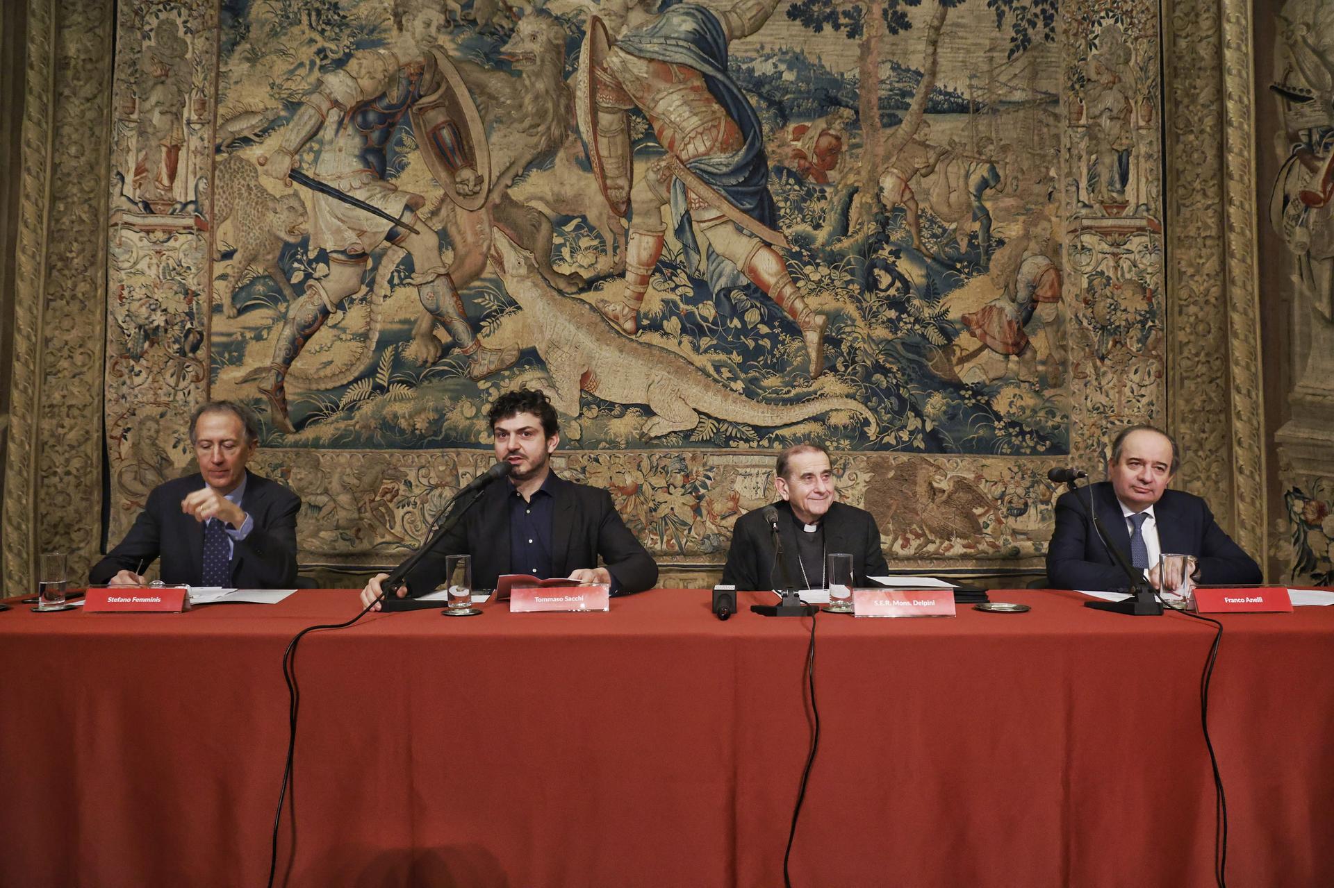 Da sinistra: Armando Buonaiuto, Valeria Cantoni Mamiani, Aurelio Mottola e monsignor Luca Bressan, componenti del Comitato curatoriale del Festival (foto Nanni Fontana – Università Cattolica)
