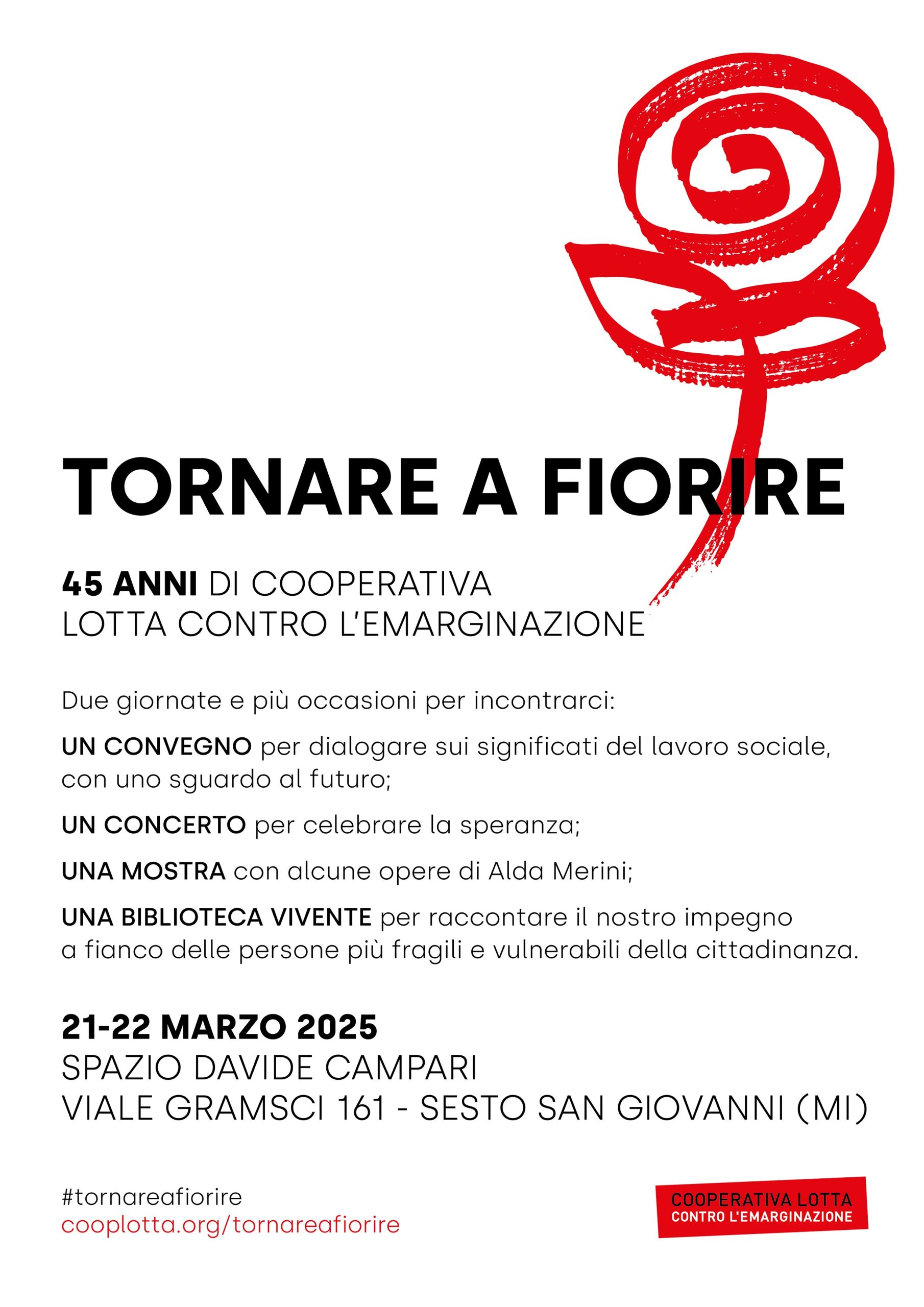 Il verso di Alda Merini “Tornare a fiorire” dà il titolo alla due giorni di dibattiti, mostre e musica organizzati da Cooperativa Lotta contro l’Emarginazione, in occasione dei suoi primi 45 anni passati a fianco dei soggetti più in difficoltà, per una società più giusta. L’appuntamento è per venerdì 21 e sabato 22 marzo, alla Galleria Davide Campari a Sesto San Giovanni (Mi – locandina).