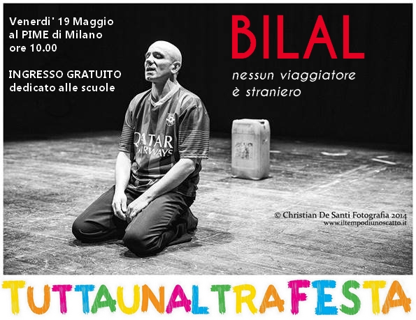 Momento centrale della prima giornata sarà lo spettacolo Bilal-nessun viaggiatore è straniero, proposto in due rappresentazioni: alla mattina alle 10.15 per i ragazzi delle scuole superiori e alle 21 per tutti. Prodotto da EgumTeatro con Leonardo Capuano e la regia di Annalisa Bianco, lo spettacolo è tratto dal libro Bilal-Viaggiare, lavorare, morire da clandestini (Bur) del giornalista Fabrizio Gatti. Bilal è il racconto di “uno di noi” che mette la sua vita in pericolo travestendosi da “straniero”, recitando una parte, per capire le motivazioni di chi prende la via delle migrazioni. È la storia di uomini e donne in fuga dalla miseria, che con ogni mezzo cercano di difendere la loro dignità, i loro corpi torturati, le loro intelligenze umiliate, le loro ambizioni negate con ferocia. Lo spettacolo sarà preceduto dalle testimonianze di produttori del commercio equo, etico e solidale che con un contributo video racconteranno la ricaduta positiva dei loro progetti come risposta alle povertà che spingono a migrare.