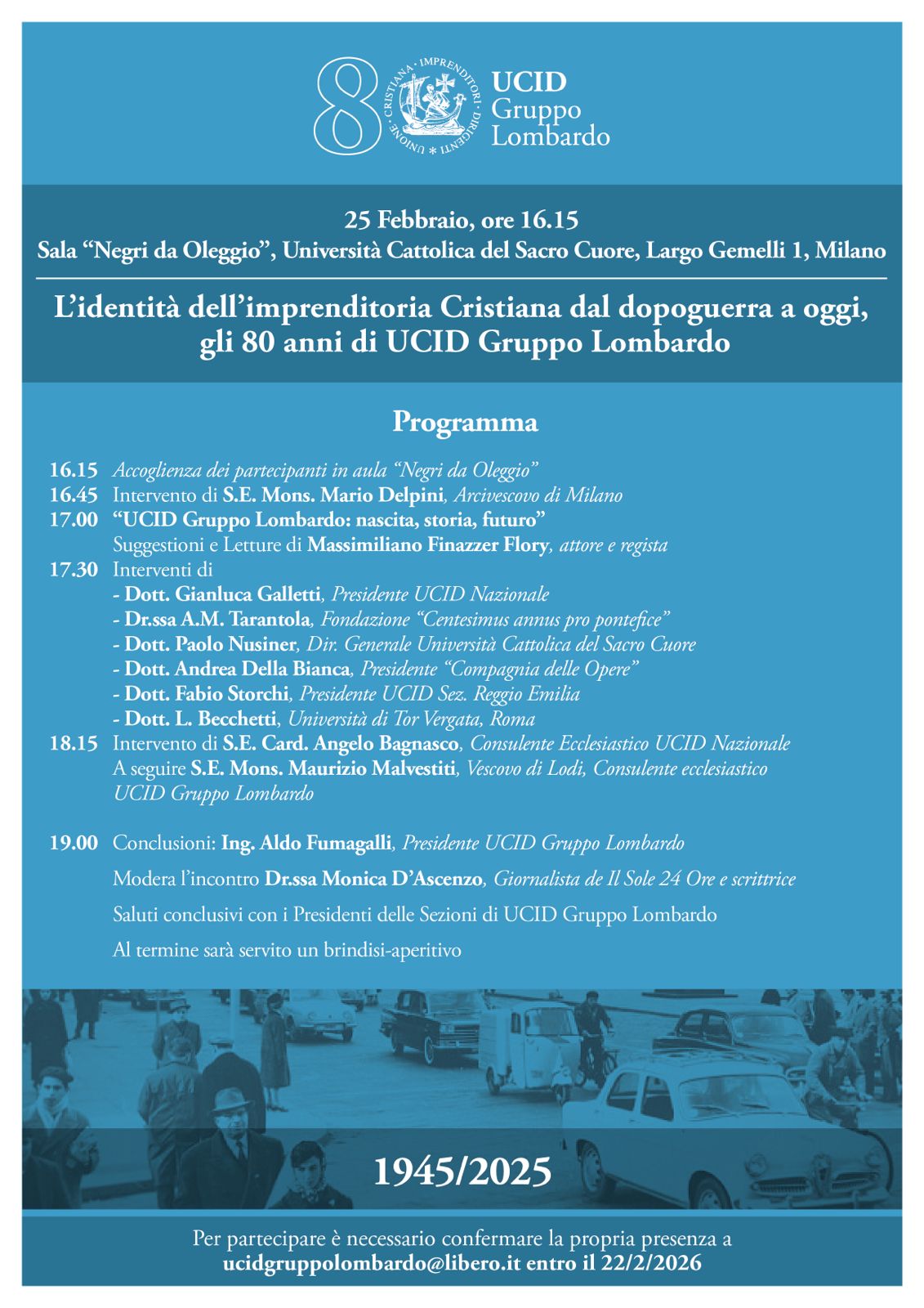 «L’identità dell’Imprenditoria cristiana dal dopoguerra a oggi» è il tema del convegno, in programma all’Università Cattolica del Sacro Cuore, mercoledì 25 febbraio dalle 16.30, con cui il Gruppo lombardo dell’Unione Cristiana Imprenditori Dirigenti (Ucid) festeggia i propri 80 anni. Insieme ad altri relatori – tra i quali il cardinale Angelo Bagnasco, già presidente della Cei – interverrà l’Arcivescovo, monsignor Mario Delpini.
