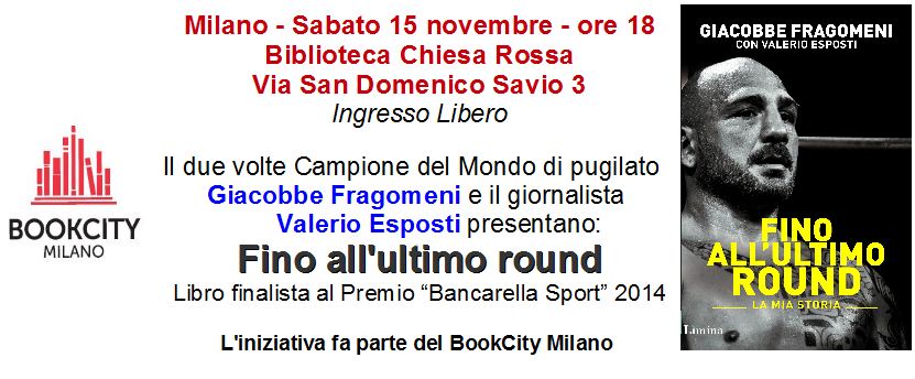 Sabato 15 novembre, alle 18, nella Biblioteca Chiesa Rossa di via San Domenico Savio 3 a Milano, il due volte campione del mondo di pugilato Giacobbe Fragomeni e lo scrittore Valerio Esposti presenteranno il libro Fino all’ultimo round nell’ambito di BookCity 2014. Don Claudio Burgio, cappellano dell’Istituto penale minorile “Cesare Beccaria” di Milano, farà da moderatore.
