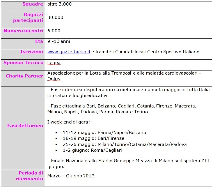 Trenta mila partecipanti, oltre 3.000 squadre, 6.000 incontri: questi sono i numeri attesi per l’edizione 2013 della manifestazione dedicata ai ragazzi tra i nove e i tredici anni che hanno voglia di divertirsi, crescere e sognare. A dieci giorni dalla chiusura delle iscrizioni on line siamo già a quota 20 mila iscritti, 2.000 squadre, 400 iscrizioni dal sito ufficiale. Un progetto in continua crescita e sempre più Nazionale: Gazzetta Cup 2013, infatti, toccherà tutte le regioni della Penisola, colorando di “rosa” l’Italia intera.