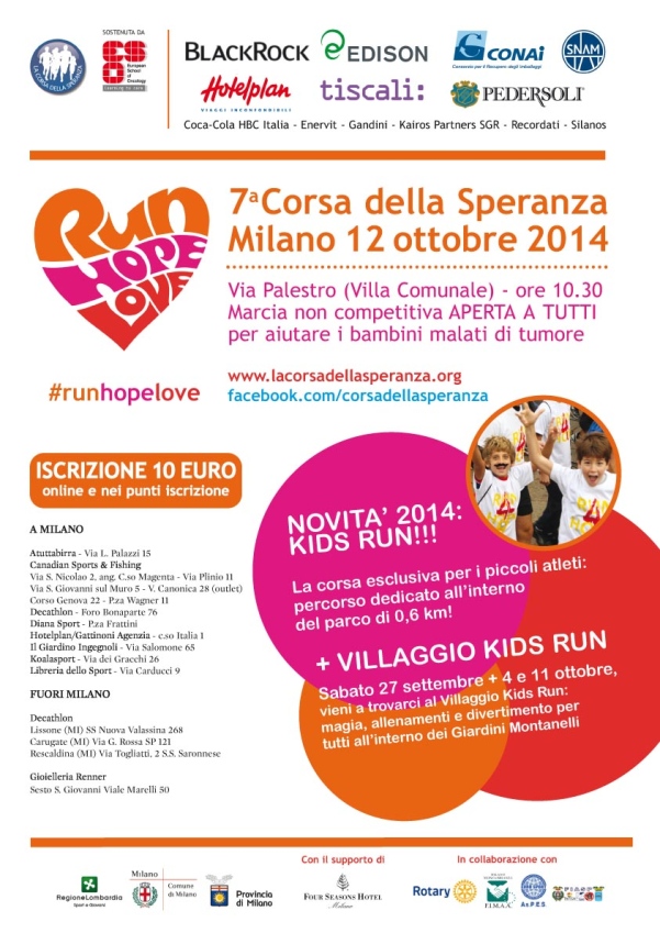Domenica 12 ottobre, presso la Villa Comunale di via Palestro a Milano, a partire dalle 10.30 è in programma la settima edizione della “Corsa della Speranza”, marcia non competitiva aperta a tutti per aiutare i bambini malati di tumore.