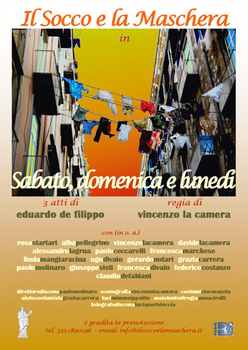 Nel trentennale della scomparsa di Eduardo De Filippo e nel proprio decennale di attività, venerdì 11 (ore 21), sabato 12 (ore 21) e domenica 13 aprile (ore 20), la Compagnia “Il Socco e la Maschera” mette in scena al Teatro San Giuseppe di Milano (via Redi 21) un nuovo allestimento di Sabato, domenica e lunedì, una delle più belle commedie del grandissimo Eduardo, in tre atti. La regia è di Vincenzo La Camera.