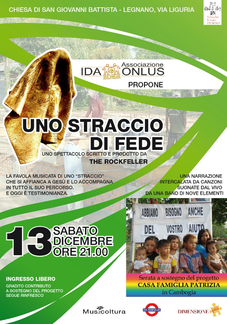 Dopo il grande successo dello scorso anno con lo spettacolo Note di solidarietà, l’associazione alza ancora la classica asticella e propone uno spettacolo – sempre ambientato nella bella chiesa parrocchiale – dal titolo Uno straccio di fede. Si tratta di un percorso musicale e narrativo scritto, prodotto e realizzato dal gruppo The Rockfeller, otto elementi che con voce e strumenti dal vivo accompagneranno il pubblico in una serata da non perdere.