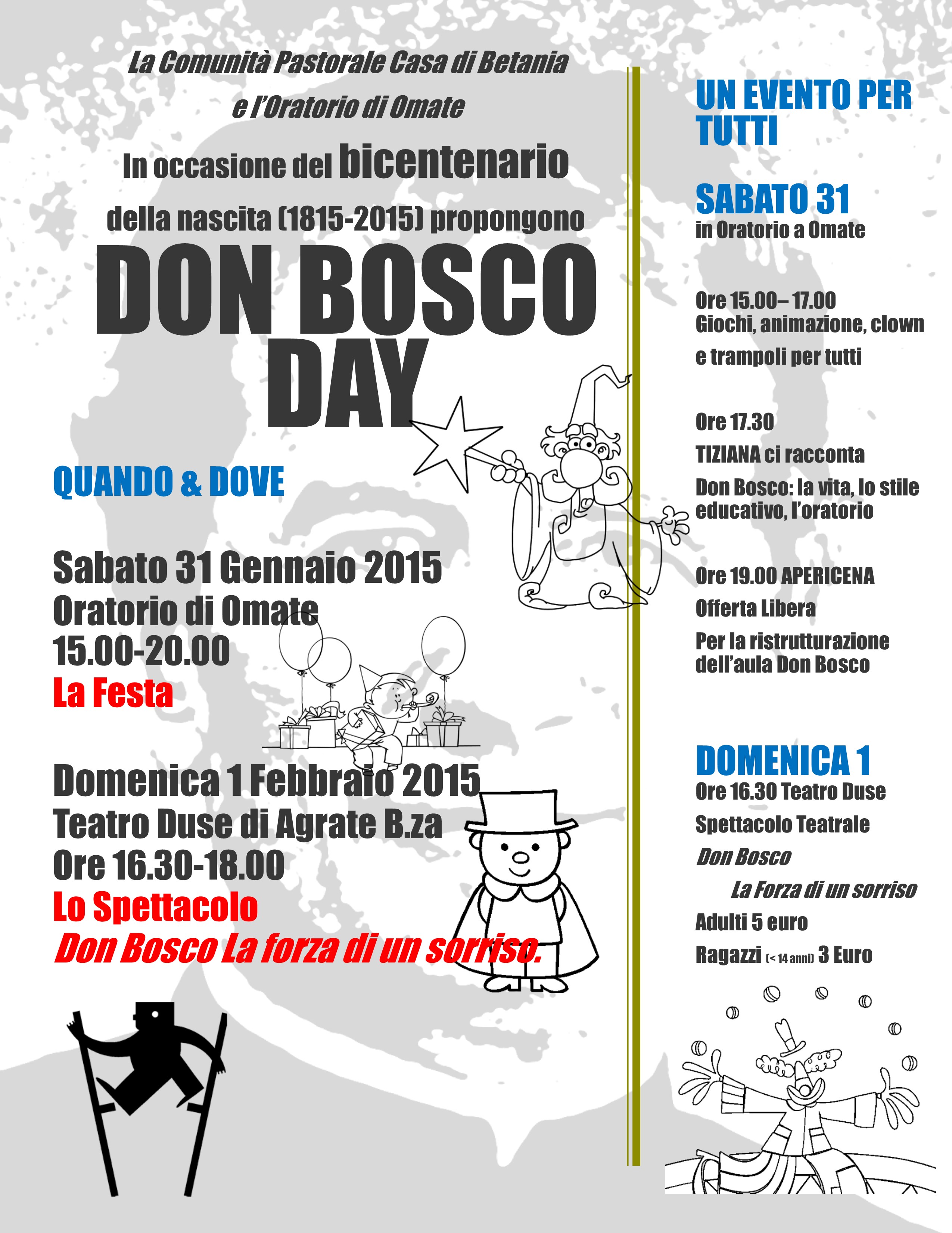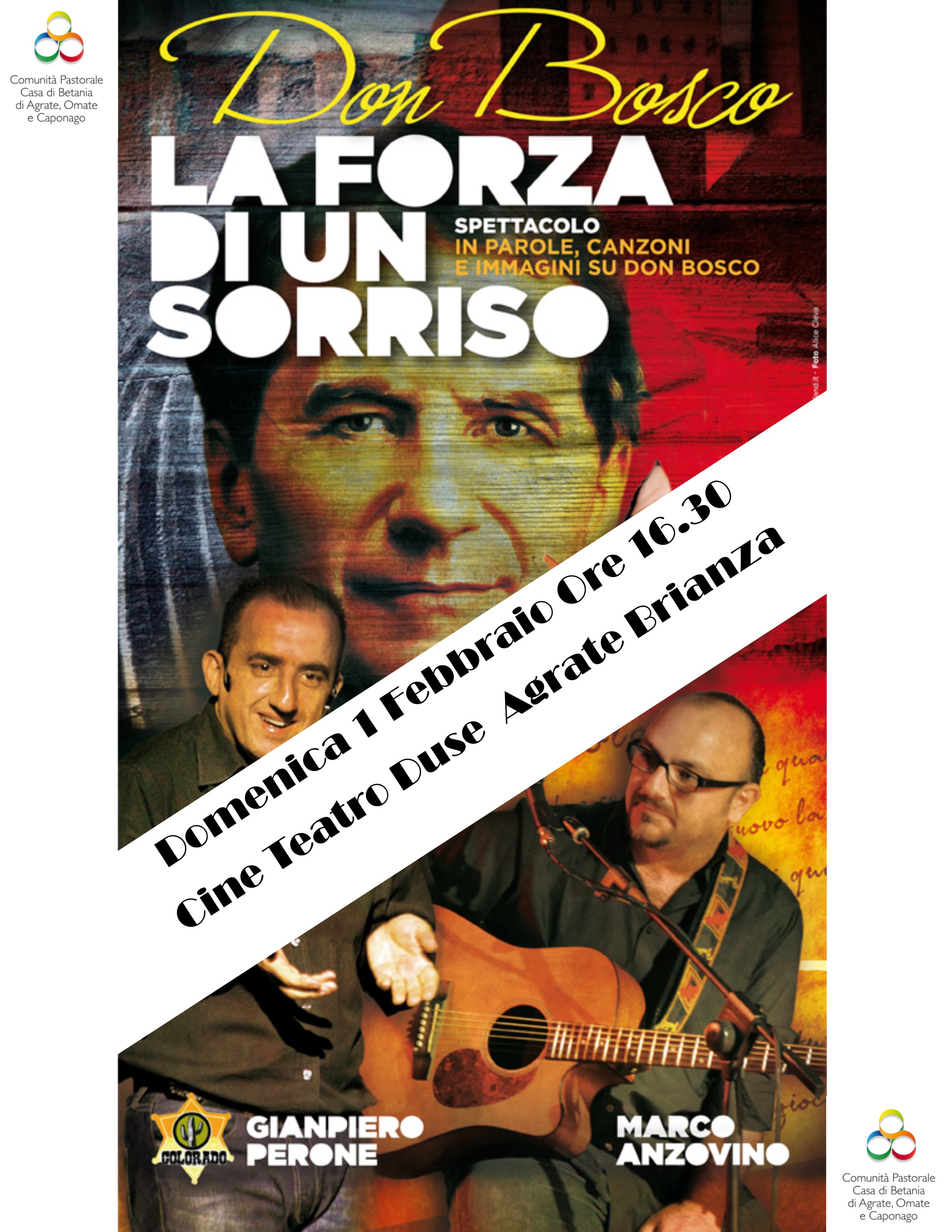 Dopo un pomeriggio nell’Oratorio di Omate, sabato 31 gennaio, tra giochi, animazione per i ragazzi, condivisione della vita del Santo e cena insieme, domenica 1 febbraio, alle 16.30, al Cineteatro Duse di Agrate Brianza verrà proposto lo spettacolo teatrale Don Bosco La forza di un sorriso, commissionato dal Movimento Giovanile Salesiano (Mgs) del Triveneto al comico Gianpiero Perone (Colorado Cafè e Zelig) e al cantautore Marco Anzovino.