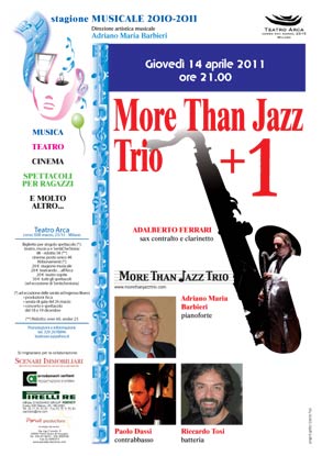 Giovedì 14 aprile, alle 21, al Teatro Arca (corso XXII Marzo 23/15, Milano), è in cartellone il concerto intitolato “More than Jazz Trio + 1”. A formare il trio sono Adriano Maria Barbieri (pianoforte), Paolo Dassi (basso) e Riccardo Tosi (batteria), ai quali si aggiunge Adalberto Ferrari (sax contralto e clarinetto). In programma alcuni standard del repertorio jazzistico, oltre ad alcuni brani originali del maestro Barbieri.