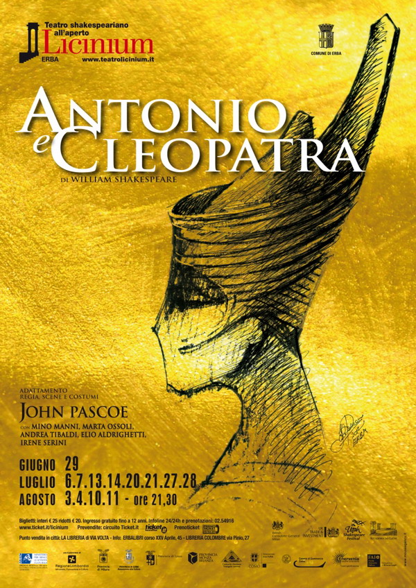È la tredicesima stagione di produzioni dell’Accademia dei Licini, la quarta consecutiva dedicata al teatro shakespeareano dopo La Tempesta (2009), La Bisbetica domata (2010) e Otello (2011) (la sesta complessiva, contando anche Sogno di una notte di mezza estate nel 2001 e Romeo e Giulietta nel 2006), ma è anche la prima senza Gianlorenzo Brambilla, il regista e direttore artistico scomparso prematuramente in marzo a seguito di una crudele malattia. E proprio a Brambilla sarà dedicata l’estate 2012 del Teatro all’aperto Licinium di Erba, che con Antonio e Cleopatra conferma il suo ruolo di unico teatro shakespeareano all’aperto d’Italia. Dopo la “prima”, venerdì 29 giugno alle 21.30, le repliche si susseguiranno ogni venerdì e sabato fino all’11 agosto.