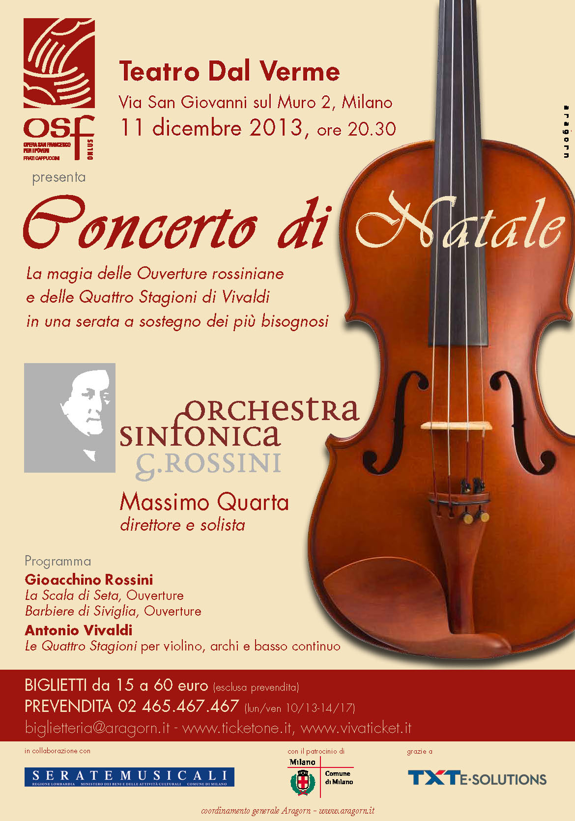 Il programma del Concerto, inserito nella stagione 2013/14 di “Serate Musicali”, prevede l’ouverture La Scala di Seta e Il Barbiere di Siviglia di Gioacchino Rossini e Le Quattro Stagioni di Antonio Vivaldi, quest’ultime eseguite da Massimo Quarta come solista. Musiche universalmente amate che offriranno al pubblico l’opportunità di trascorre una piacevole serata e al tempo stesso sostenere Opera San Francesco nel suo impegno concreto al fianco dei poveri.