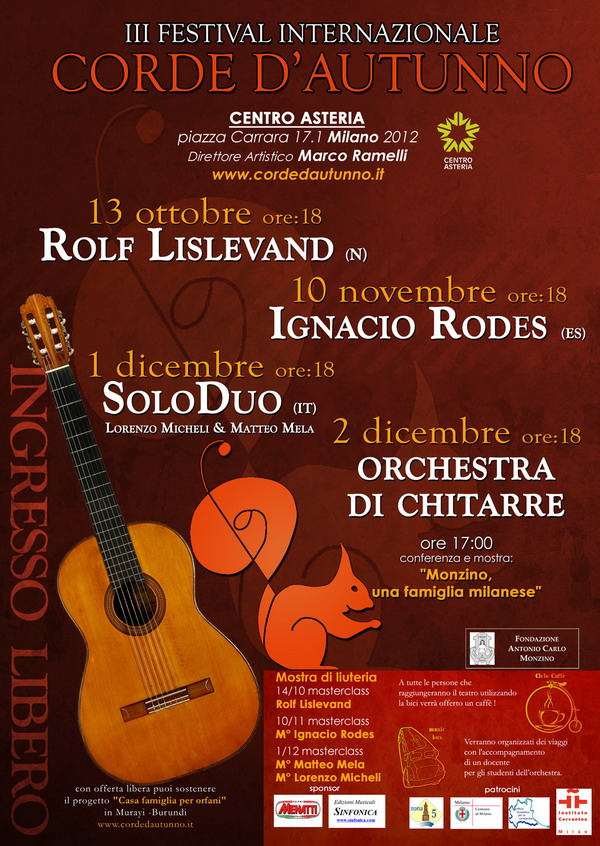 Musica, e non solo, al Centro Asteria di Milano (piazza Carrara 17.1), per la terza edizione del Festival internazionale chitarristico “Corde d’Autunno”, dedicato soprattutto ai giovani. La manifestazione potrà fregiarsi della partecipazione di artisti di fama internazionale del calibro di Rolf Lislevand (13 ottobre), Ignacio Rodes (10 novembre) e il SoloDuo (1 dicembre) che si esibiranno in concerti a ingresso libero (ore 18) e terranno masterclass e seminari. Il laboratorio orchestrale, che si terrà nelle stesse date e anche il 28 ottobre (ore 15) riunirà studenti provenienti dalle più variegate realtà didattiche non solo di Milano e hinterland, ma dell’intera Lombardia.