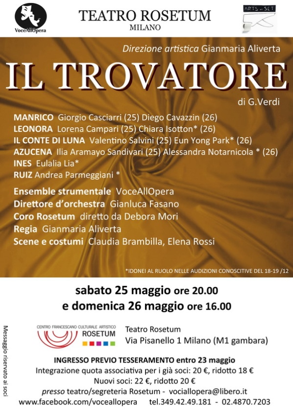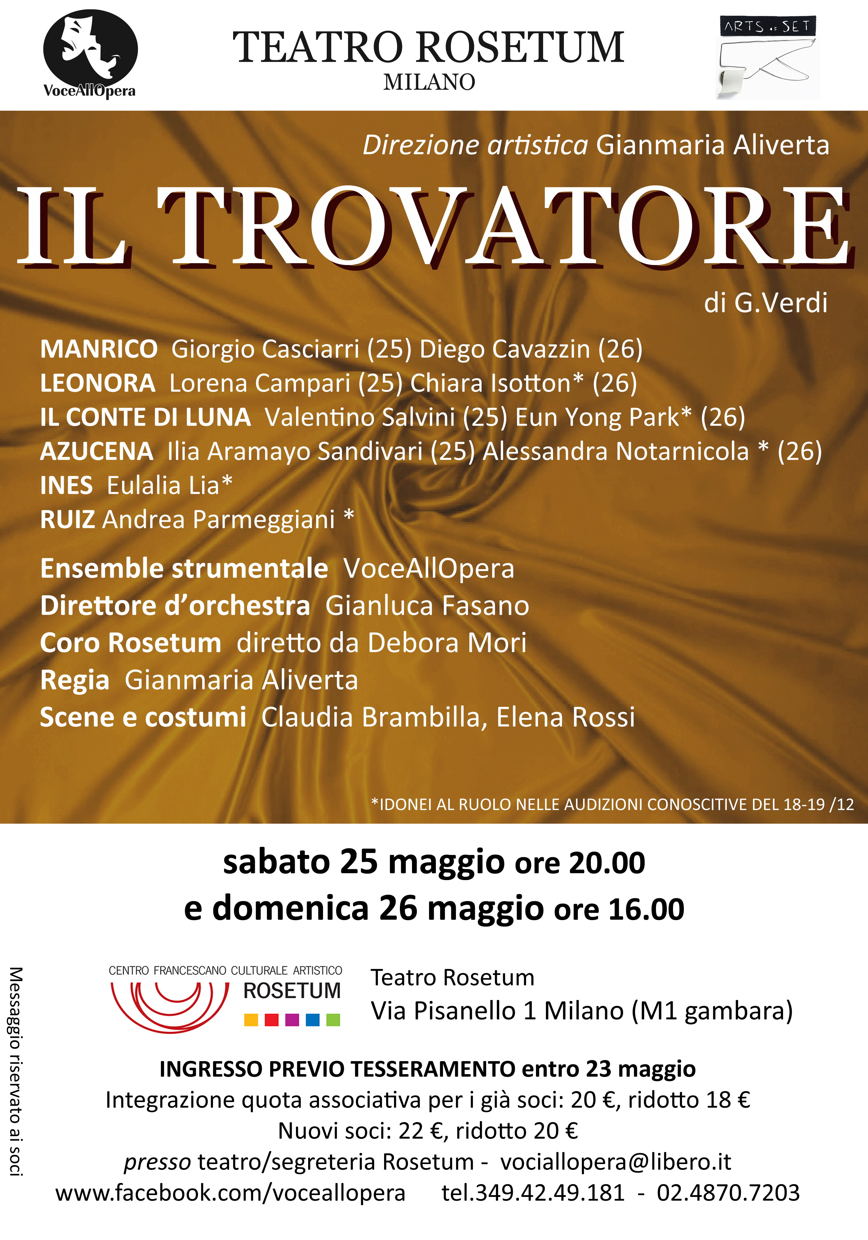 Sabato 25 (alle 20.30) e domenica 26 maggio (alle 16), presso il Teatro Rosetum (via Pisanello 1, Milano), andrà in scena l’opera Il Trovatore di Giuseppe Verdi, grazie alla collaborazione con l’Associazione culturale VoceAllOpera. Si conclude così la trilogia verdiana andata in scena sul palco del Rosetum in questi mesi.